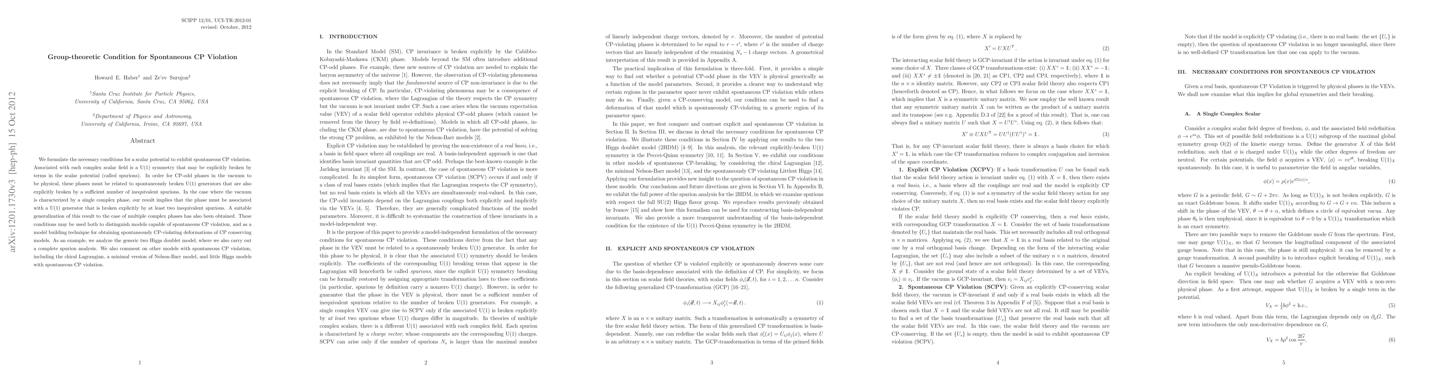 This paper formulates necessary group-theoretic conditions for scalar potentials to exhibit spontaneous CP violation, requiring explicit breaking of U(1) symmetries by spurions. It provides a method to identify and construct models with spontaneous CP violation, illustrated through an analysis of the two Higgs doublet model and other related frameworks.