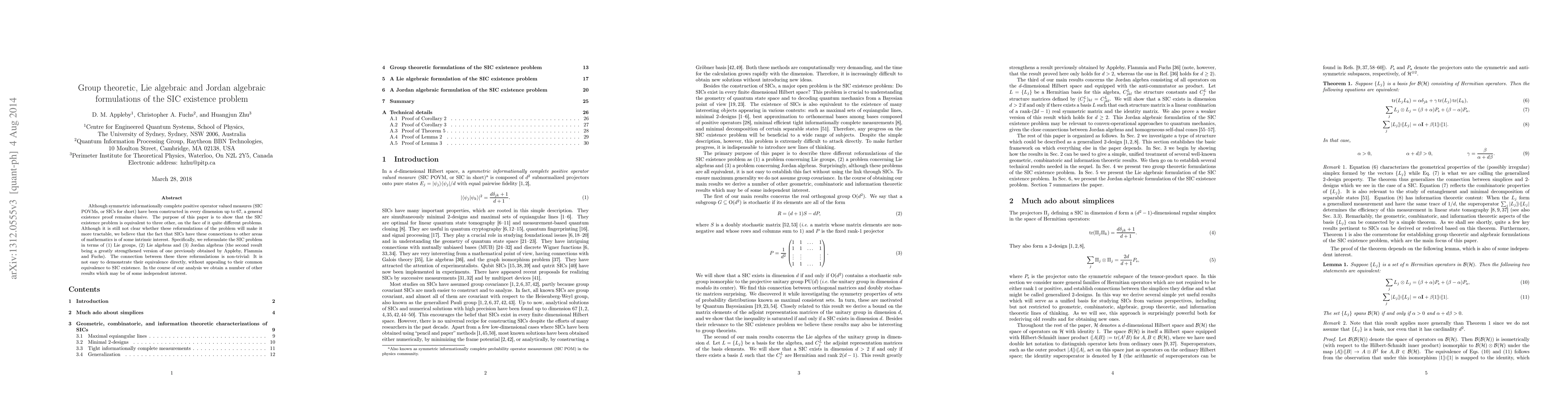 This paper establishes that the Symmetric Informationally Complete POVM (SIC) existence problem is mathematically linked to Lie groups, Lie algebras, and Jordan algebras, providing new perspectives but not an immediate solution. The equivalence of these reformulations is shown to be intricate, with additional results of independent interest.