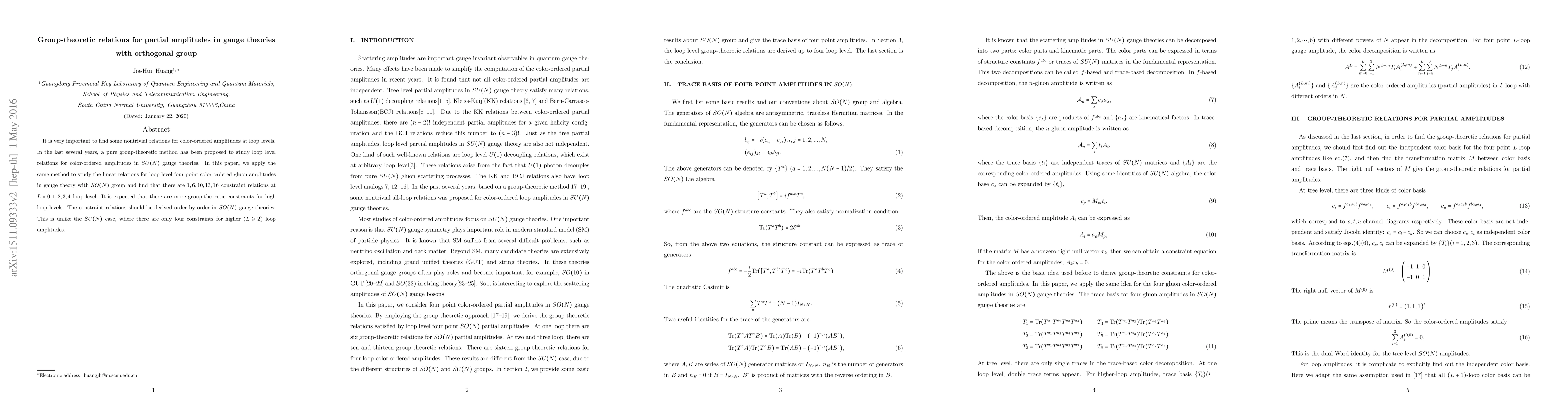 It is very important to find some nontrivial relations for color-ordered amplitudes at loop levels. In the last several years, a pure group-theoretic method has been proposed to study loop level relations for color-ordered amplitudes in $\sun$ gauge theories. In this paper, we apply the same method to study the linear relations for loop level four point color-ordered gluon amplitudes in gauge theory with $\son$ group and find that there are $1,6,10,13,16$ constraint relations at $L=0,1,2,3,4$ loop level. It is expected that there are more group-theoretic constraints for high loop levels. The constraint relations should be derived order by order in $\son$ gauge theories. This is unlike the $\sun$ case, where there are only four constraints for higher $(L\geqslant 2)$ loop amplitudes.
