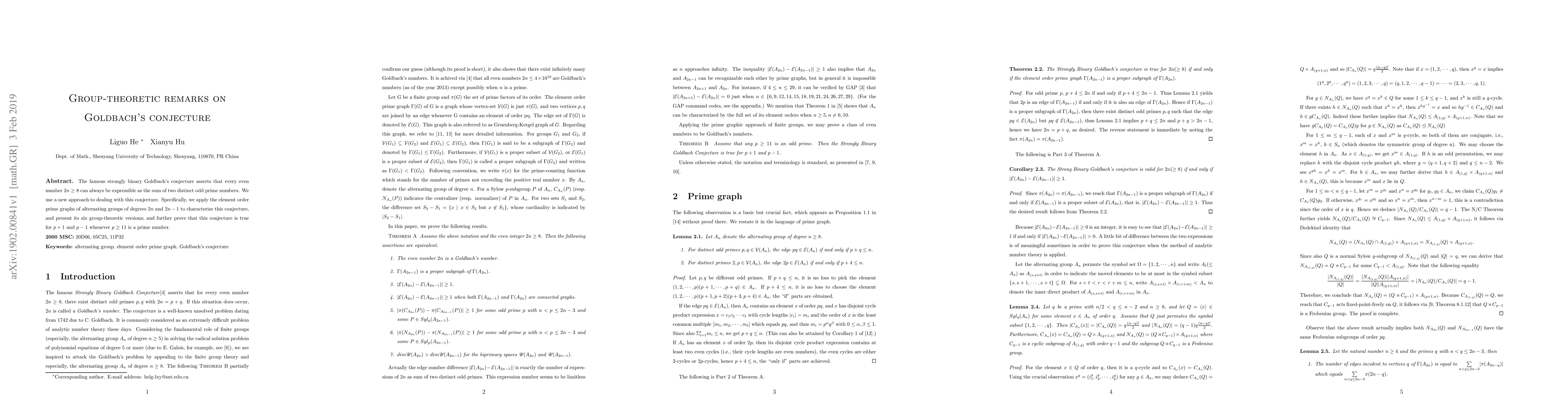 The famous strongly binary Goldbach's conjecture asserts that every even number $2n \geq 8$ can always be expressible as the sum of two distinct odd prime numbers. We use a new approach to dealing with this conjecture. Specifically, we apply the element order prime graphs of alternating groups of degrees $2n$ and $2n-1$ to characterize this conjecture, and present its six group-theoretic versions; and further prove that this conjecture is true for $p+1$ and $p-1$ whenever $p \geq 11$ is a prime number.