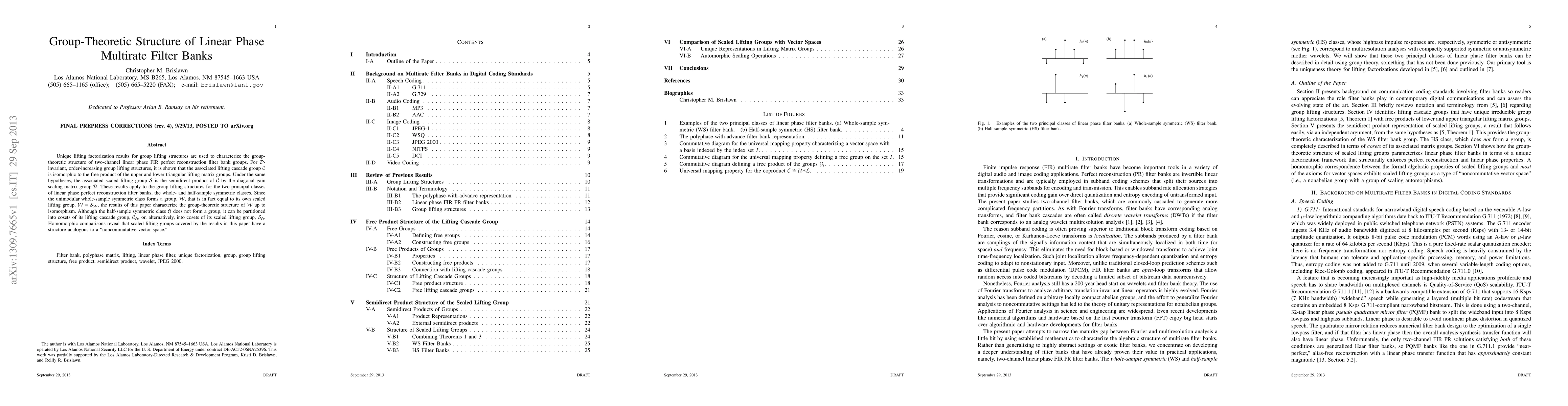 This paper characterizes the group-theoretic structure of two-channel linear phase FIR perfect reconstruction filter banks using unique lifting factorization results. It shows that the lifting cascade group C is isomorphic to the free product of upper and lower triangular lifting matrix groups, and the scaled lifting group S is the semidirect product of C by the diagonal gain scaling matrix group D.