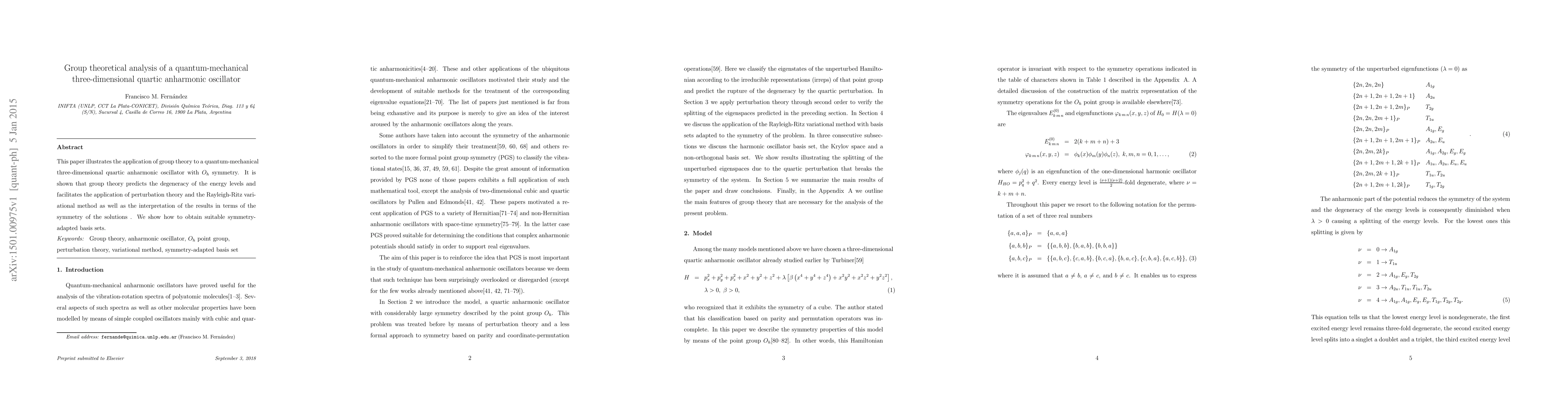 This paper applies group theory to analyze a three-dimensional quartic anharmonic oscillator with $O_{h}$ symmetry, predicting energy level degeneracies and aiding perturbation and variational methods through symmetry-adapted basis sets. The results are interpreted in terms of the symmetry of the solutions.