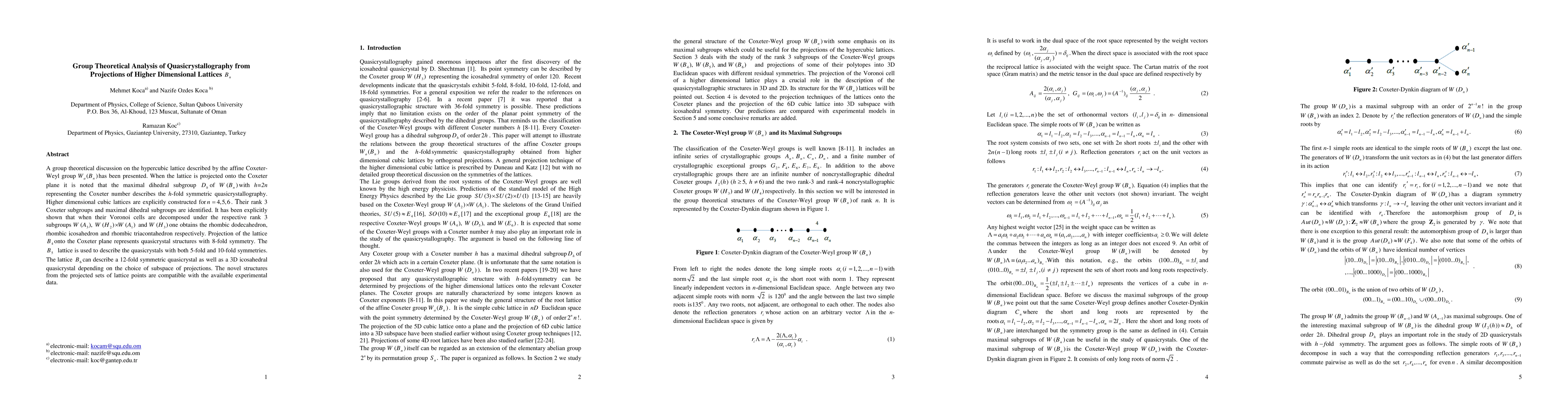 A group theoretical discussion on the hypercubic lattice described by the affine Coxeter-Weyl group Wa(Bn) has been presented. When the lattice is projected onto the Coxeter plane it is noted that the maximal dihedral subgroup Dh of W(Bn) with h = 2n representing the Coxeter number describes the h-fold symmetric quasicrystallography. Higher dimensional cubic lattices are explicitly constructed for n = 4, 5, 6. Their rank 3 Coxeter subgroups and maximal dihedral subgroups are identified. It has been explicitly shown that when their Voronoi cells are decomposed under the respective rank 3 subgroups W(A3),W(H2) x W(A1) and W(H3) one obtains the rhombic dodecahedron, rhombic icosahedron and rhombic triacontahedron respectively. Projection of the lattice B4 onto the Coxeter plane represents quasicrystal structures with 8-fold symmetry. The B5 lattice is used to describe the quasicrystals with both 5-fold and 10-fold symmetries. The lattice B6 can describe a 12-fold symmetric quasicrystal as well as a 3D icosahedral quasicrystal depending on the choice of subspace of projections. The novel structures from the projected sets of lattice points are compatible with the available experimental data.