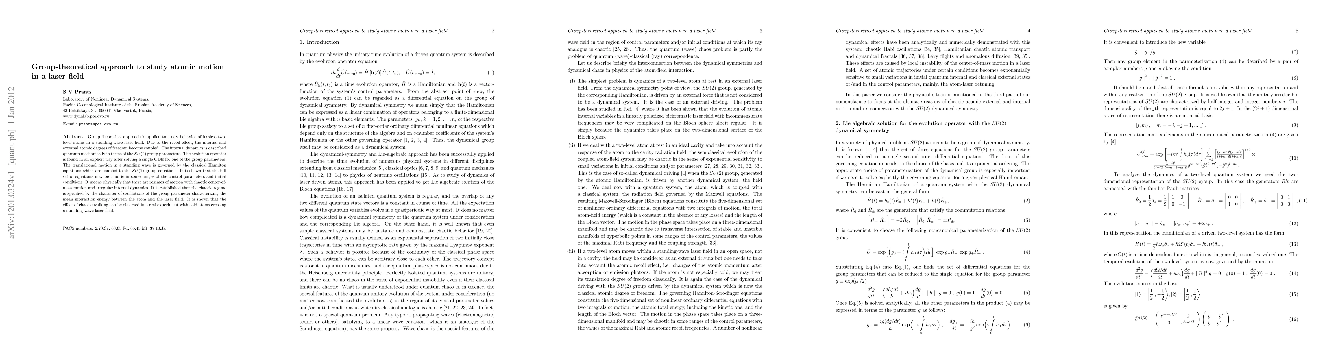 Group-theoretical approach is applied to study behavior of lossless two-level atoms in a standing-wave laser field. Due to the recoil effect, the internal and external atomic degrees of freedom become coupled. The internal dynamics is described quantum mechanically in terms of the SU(2) group parameters. The evolution operator is found in an explicit way after solving a single ODE for one of the group parameters. The translational motion in a standing wave is governed by the classical Hamilton equations which are coupled to the SU(2) group equations. It is shown that the full set of equations may be chaotic in some ranges of the control parameters and initial conditions. It means physically that there are regimes of motion with chaotic center-of-mass motion and irregular internal dynamics. It is established that the chaotic regime is specified by the character of oscillations of the group parameter characterizing the mean interaction energy between the atom and the laser field. It is shown that the effect of chaotic walking can be observed in a real experiment with cold atoms crossing a standing-wave laser field.