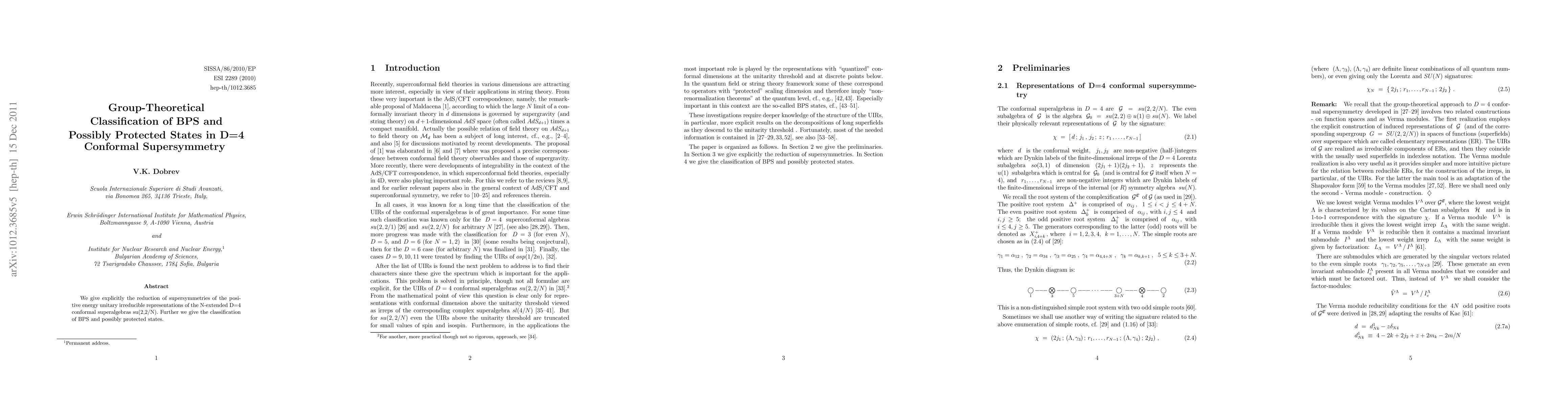 This paper classifies BPS and possibly protected states in D=4 conformal supersymmetry using group theory, providing a framework for understanding the nature of these states.
