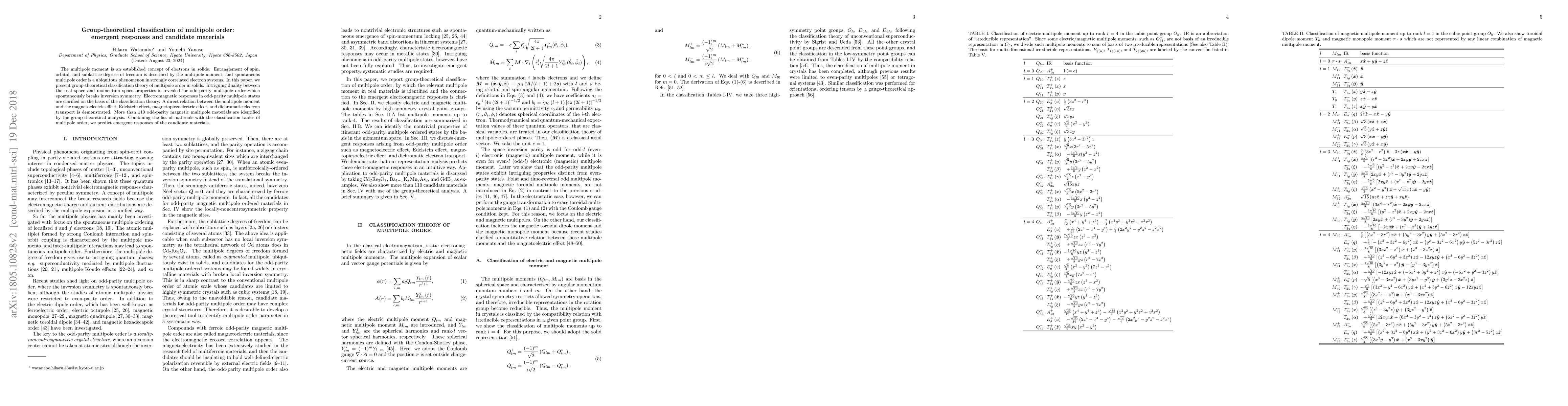 The multipole moment is an established concept of electrons in solids. Entanglement of spin, orbital, and sublattice degrees of freedom is described by the multipole moment, and spontaneous multipole order is a ubiquitous phenomenon in strongly correlated electron systems. In this paper, we present group-theoretical classification theory of multipole order in solids. Intriguing duality between the real space and momentum space properties is revealed for odd-parity multipole order which spontaneously breaks inversion symmetry. Electromagnetic responses in odd-parity multipole states are clarified on the basis of the classification theory. A direct relation between the multipole moment and the magnetoelectric effect, Edelstein effect, magnetopiezoelectric effect, and dichromatic electron transport is demonstrated. More than 110 odd-parity magnetic multipole materials are identified by the group-theoretical analysis. Combining the list of materials with the classification tables of multipole order, we predict emergent responses of the candidate materials.