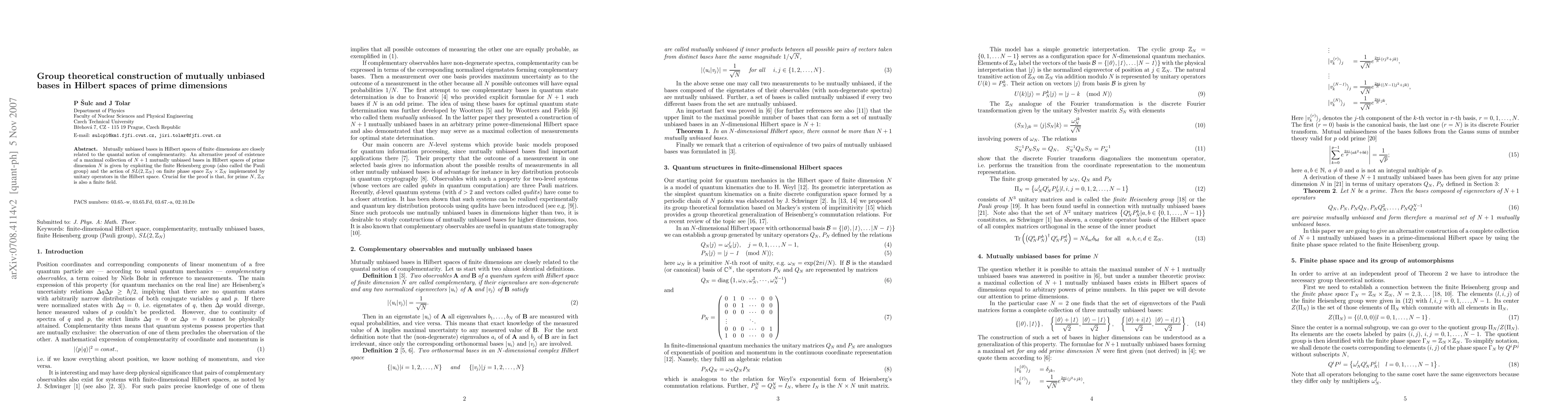 Mutually unbiased bases in Hilbert spaces of finite dimensions are closely related to the quantal notion of complementarity. An alternative proof of existence of a maximal collection of N+1 mutually unbiased bases in Hilbert spaces of prime dimension N is given by exploiting the finite Heisenberg group (also called the Pauli group) and the action of SL(2,Z_N) on finite phase space Z_N x Z_N implemented by unitary operators in the Hilbert space. Crucial for the proof is that, for prime N, Z_N is also a finite field.
