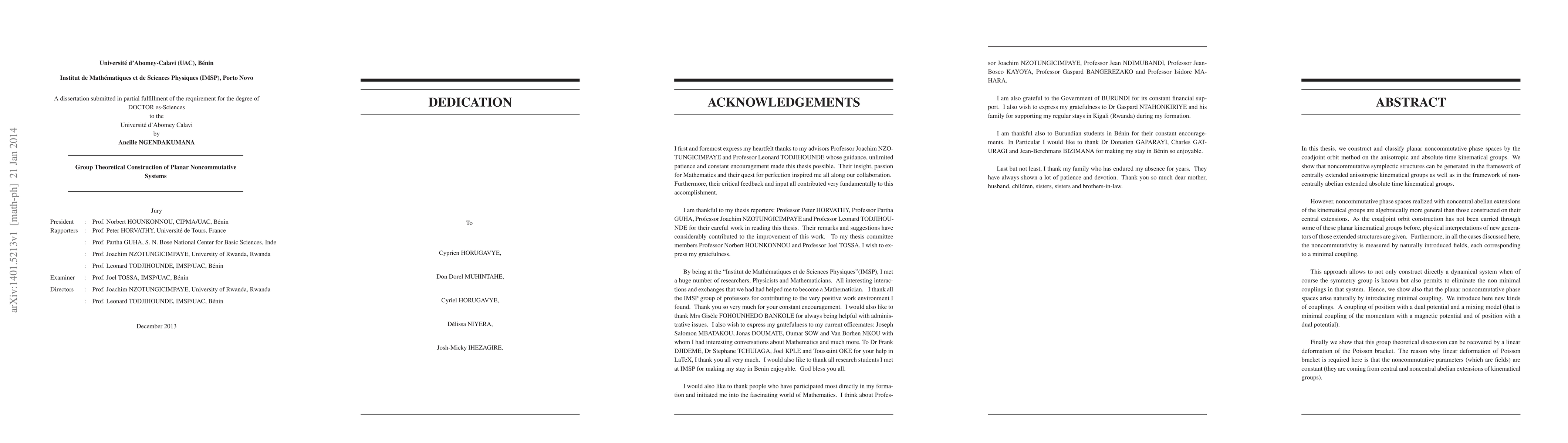 In this thesis, we construct and classify planar noncommutative phase spaces by the coadjoint orbit method on the anisotropic and absolute time kinematical groups. We show that noncommutative symplectic structures can be generated in the framework of centrally extended anisotropic kinematical groups as well as in the framework of noncentrally abelian extended absolute time kinematical groups. However, noncommutative phase spaces realized with noncentral abelian extensions of the kinematical groups are algebraically more general than those constructed on their central extensions. As the coadjoint orbit construction has not been carried through some of these planar kinematical groups before, physical interpretations of new generators of those extended structures are given. Furthermore, in all the cases discussed here, the noncommutativity is measured by naturally introduced fields, each corresponding to a minimal coupling. This approach allows to not only construct directly a dynamical system when of course the symmetry group is known but also permits to eliminate the non minimal couplings in that system. Hence, we show also that the planar noncommutative phase spaces arise naturally by introducing minimal coupling. We introduce here new kinds of couplings. A coupling of position with a dual potential and a mixing model (that is minimal coupling of the momentum with a magnetic potential and of position with a dual potential). Finally we show that this group theoretical discussion can be recovered by a linear deformation of the Poisson bracket. The reason why linear deformation of Poisson bracket is required here is that the noncommutative parameters (which are fields) are constant (they are coming from central and noncentral abelian extensions of kinematical groups).