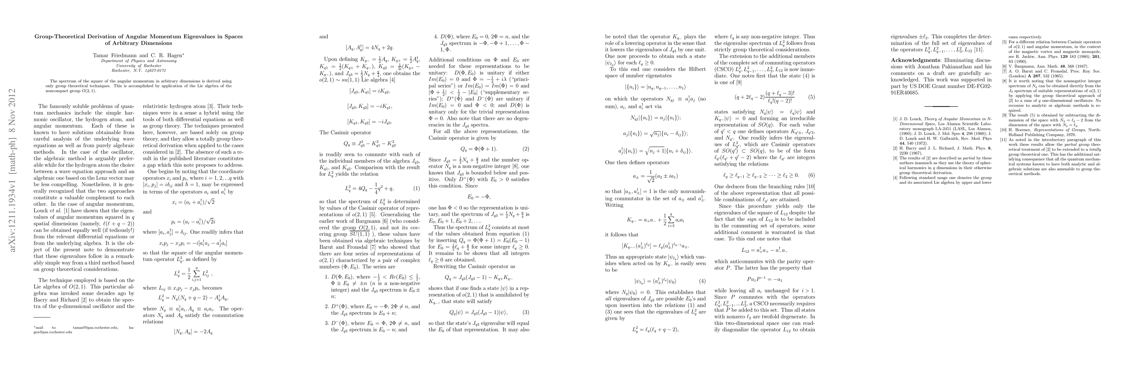 This paper derives the eigenvalues of angular momentum squared in spaces of any dimension using group theoretical methods, specifically the Lie algebra of the noncompact group O(2,1). The approach provides a novel perspective on angular momentum in higher dimensions.