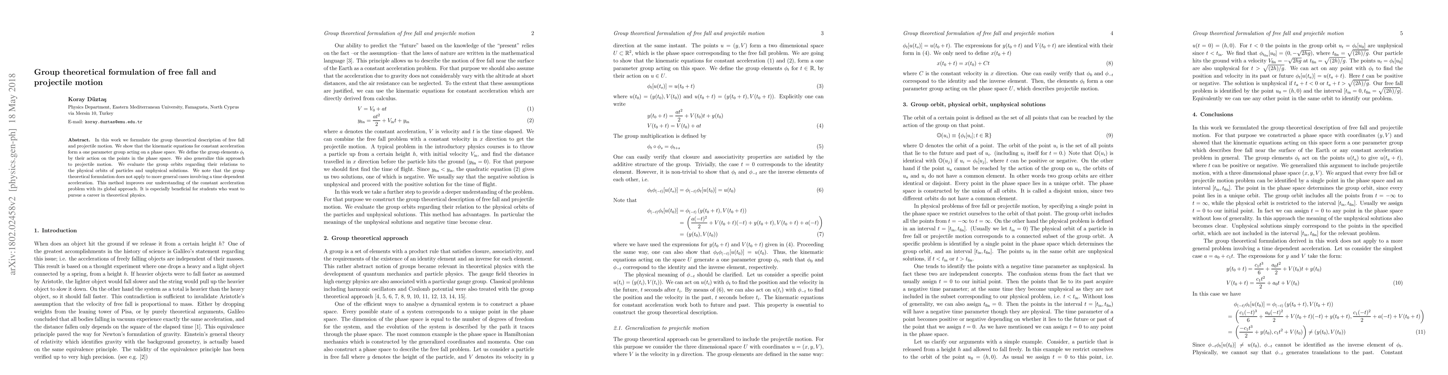 In this work we formulate the group theoretical description of free fall and projectile motion. We show that the kinematic equations for constant acceleration form a one parameter group acting on a phase space. We define the group elements $\phi_t$ by their action on the points in the phase space. We also generalize this approach to projectile motion. We evaluate the group orbits regarding their relations to the physical orbits of particles and unphysical solutions. We note that the group theoretical formulation does not apply to more general cases involving a time dependent acceleration. This method improves our understanding of the constant acceleration problem with its global approach. It is especially beneficial for students who want to pursue a career in theoretical physics.