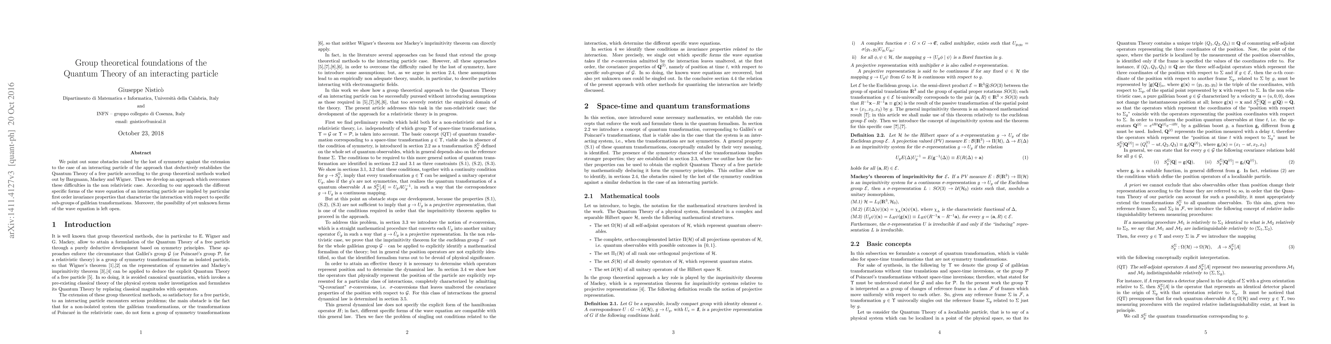 {We point out some obstacles raised by the lost of symmetry against the extension to the case of an interacting particle of the approach that {\sl deductively} establishes the Quantum Theory of a free particle according to the group theoretical methods worked out by Bargmann, Mackey and Wigner. Then we develop an approach which overcomes these difficulties in the non relativistic case. According to our approach the different specific forms of the wave equation of an interacting particle are implied by particular first order invariance properties that characterize the interaction with respect to specific sub-groups of galileian transformations. Moreover, the possibility of yet unknown forms of the wave equation is left open.