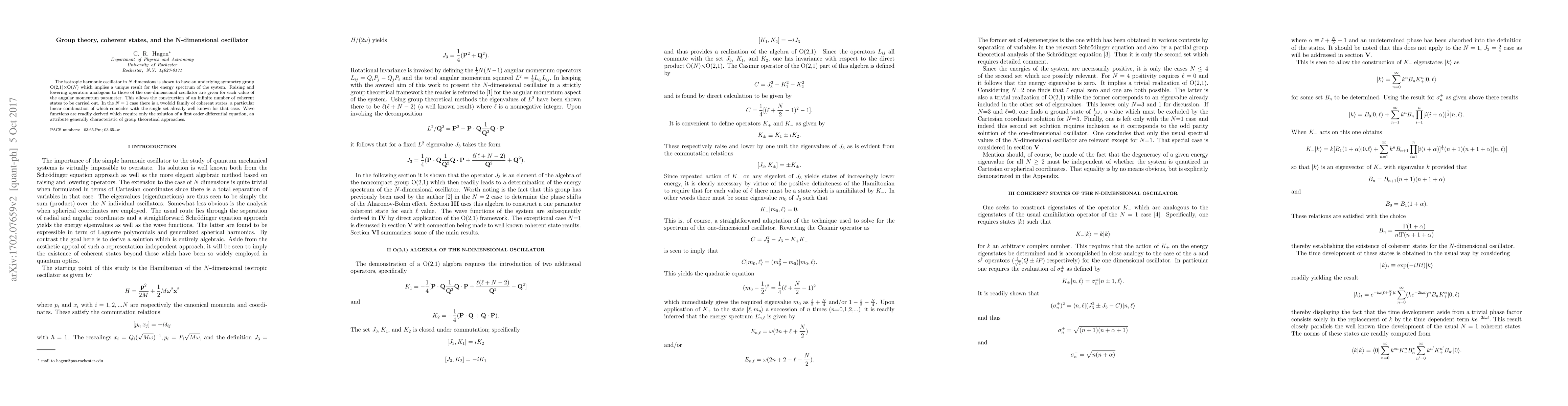 The isotropic harmonic oscillator in N dimensions is shown to have an underlying symmetry group O(2,1)X O(N)which implies a unique result for the energy spectrum of the system. Raising and lowering operators analogous to those of the one-dimensional oscillator are given for each value of the angular momentum parameter. This allows the construction of an infinite number of coherent states to be carried out. In the N=1 case there is a twofold family of coherent states, a particular linear combination of which coincides with the single set already well known for that case. Wave functions are readily derived which require only the solution of a first order differential equation, an attribute generally characteristic of group theoretical approaches.