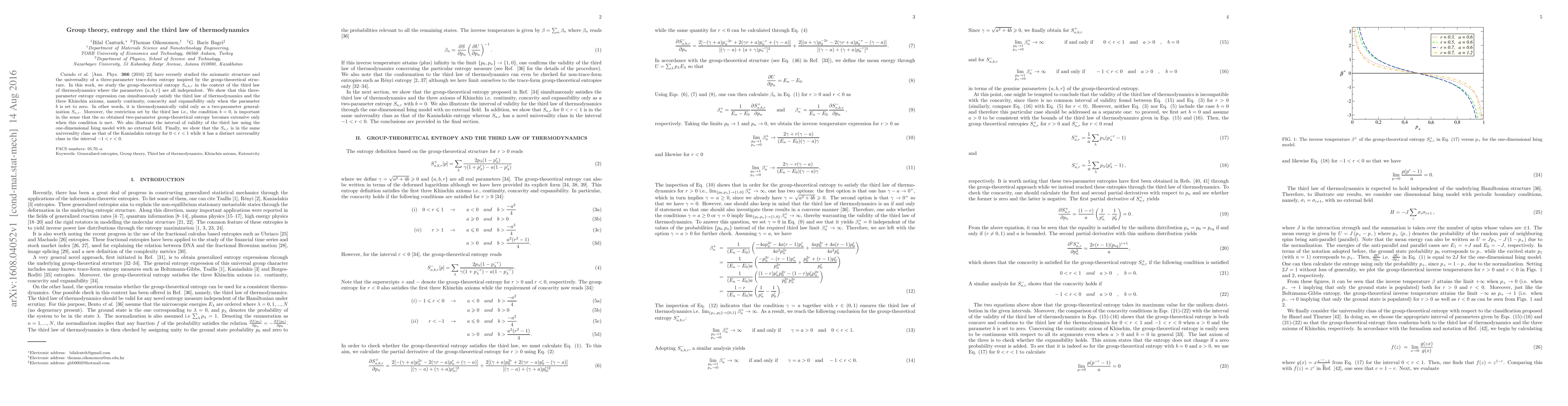 This paper investigates the group-theoretical entropy $S_{a,b,r}$ in relation to the third law of thermodynamics, finding that it satisfies the law and the Khinchin axioms only when $b=0$. The two-parameter entropy $S_{a,r}$ is shown to be extensive under this condition and shares universality with Kaniadakis entropy for $0 < r < 1$, but has a distinct class for $-1 < r < 0$.