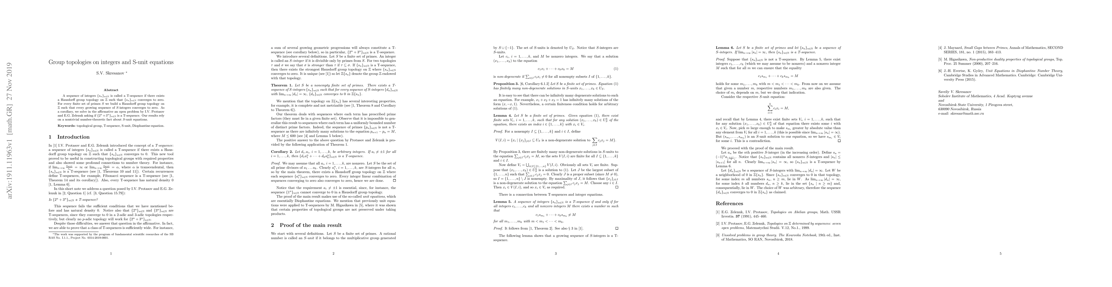 A sequence of integers $ \{ s_n \}_{n \in \mathbb{N}} $ is called a T-sequence if there exists a Hausdorff group topology on $ \mathbb{Z} $ such that $ \{ s_n \}_{n \in \mathbb{N}} $ converges to zero. For every finite set of primes $ S $ we build a Hausdorff group topology on $ \mathbb{Z} $ such that every growing sequence of $ S $-integers converges to zero. As a corollary, we solve in the affirmative an open problem by I.V. Protasov and E.G. Zelenuk asking if $ \{ 2^n + 3^n \}_{n \in \mathbb{N}} $ is a T-sequence. Our results rely on a nontrivial number-theoretic fact about $ S $-unit equations.