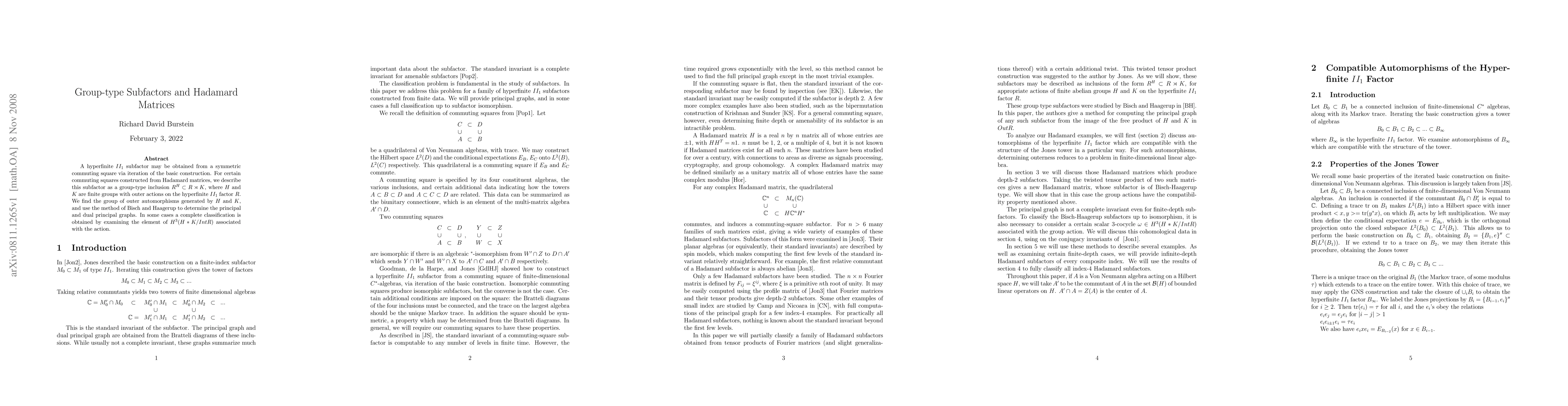 This paper explores the relationship between Hadamard matrices and hyperfinite $II_1$ subfactors, describing a subfactor as a group-type inclusion $R^H \subset R \rtimes K$. It classifies the group of outer automorphisms and determines the principal and dual principal graphs using Bisch and Haagerup's method.