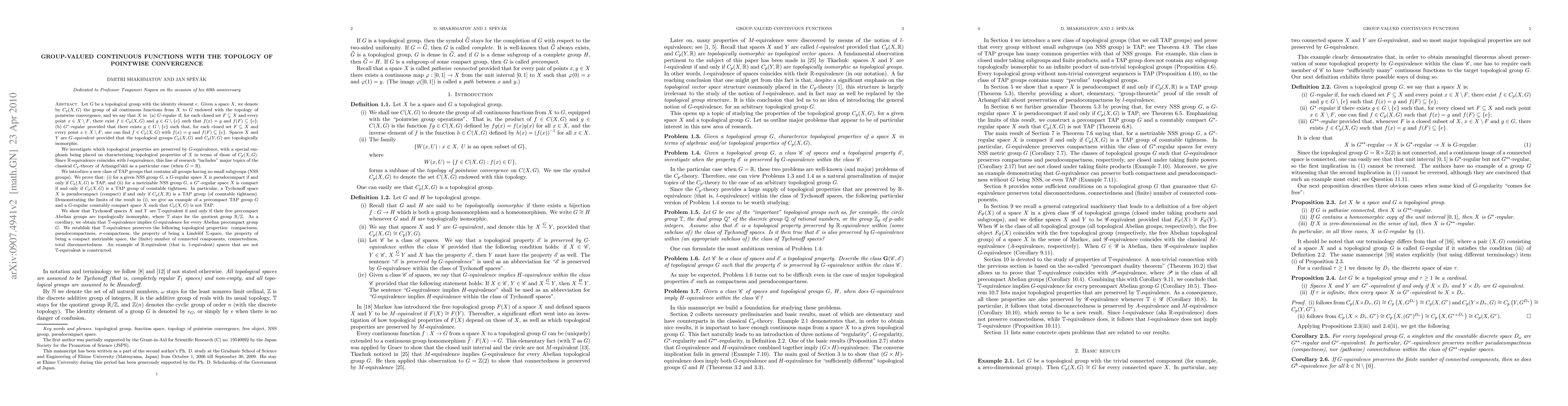 We denote by C_p(X,G) the group of all continuous functions from a space X to a topological group G endowed with the topology of pointwise convergence. We say that spaces X and Y are G-equivalent provided that the topological groups C_p(X,G) and C_p(Y,G) are topologically isomorphic. We investigate which topological properties are preserved by G-equivalence, with a special emphasis being placed on characterizing topological properties of X in terms of those of C_p(X,G). Since R-equivalence coincides with l-equivalence, this line of research "includes" major topics of the classical C_p-theory of Arhangel'skii as a particular case (when G = R). We introduce a new class of TAP groups that contains all groups having no small subgroups (NSS groups). We prove that: (i) for a given NSS group G, a G-regular space X is pseudocompact if and only if C_p(X,G) is TAP, and (ii) for a metrizable NSS group G, a G^*-regular space X is compact if and only if C_p(X,G) is a TAP group of countable tightness. In particular, a Tychonoff space X is pseudocompact (compact) if and only if C_p(X,R) is a TAP group (of countable tightness). We show that Tychonoff spaces X and Y are T-equivalent if and only if their free precompact Abelian groups are topologically isomorphic, where T stays for the quotient group R/Z. As a corollary, we obtain that T-equivalence implies G-equivalence for every Abelian precompact group G. We establish that T-equivalence preserves the following topological properties: compactness, pseudocompactness, sigma-compactness, the property of being a Lindelof Sigma-space, the property of being a compact metrizable space, the (finite) number of connected components, connectedness, total disconnectedness. An example of R-equivalent (that is, l-equivalent) spaces that are not T-equivalent is constructed.