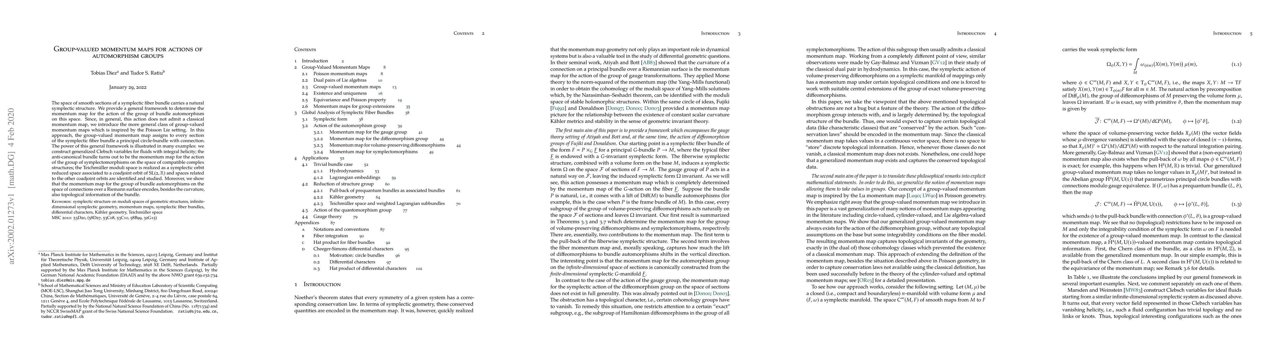 The space of smooth sections of a symplectic fiber bundle carries a natural symplectic structure. We provide a general framework to determine the momentum map for the action of the group of bundle automorphism on this space. Since, in general, this action does not admit a classical momentum map, we introduce the more general class of group-valued momentum maps which is inspired by the Poisson Lie setting. In this approach, the group-valued momentum map assigns to every section of the symplectic fiber bundle a principal circle-bundle with connection. The power of this general framework is illustrated in many examples: we construct generalized Clebsch variables for fluids with integral helicity; the anti-canonical bundle turns out to be the momentum map for the action of the group of symplectomorphisms on the space of compatible complex structures; the Teichm\"uller moduli space is realized as a symplectic orbit reduced space associated to a coadjoint orbit of $\mathrm{SL}(2,\mathbb{R})$ and spaces related to the other coadjoint orbits are identified and studied. Moreover, we show that the momentum map for the group of bundle automorphisms on the space of connections over a Riemann surface encodes, besides the curvature, also topological information of the bundle.