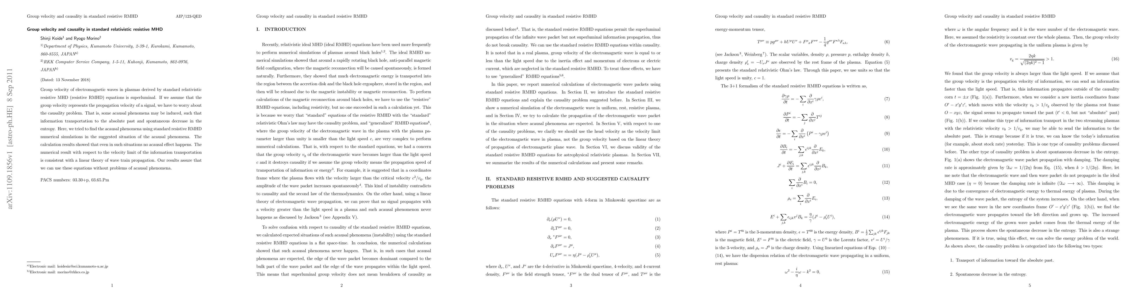 This paper investigates the group velocity in standard relativistic resistive magnetohydrodynamics (resistive RMHD), finding it to be superluminal, which raises concerns about causality. Through numerical simulations, the authors demonstrate that no acausal phenomena, such as backward information transport or entropy decrease, occur, confirming the applicability of resistive RMHD without causality violations.