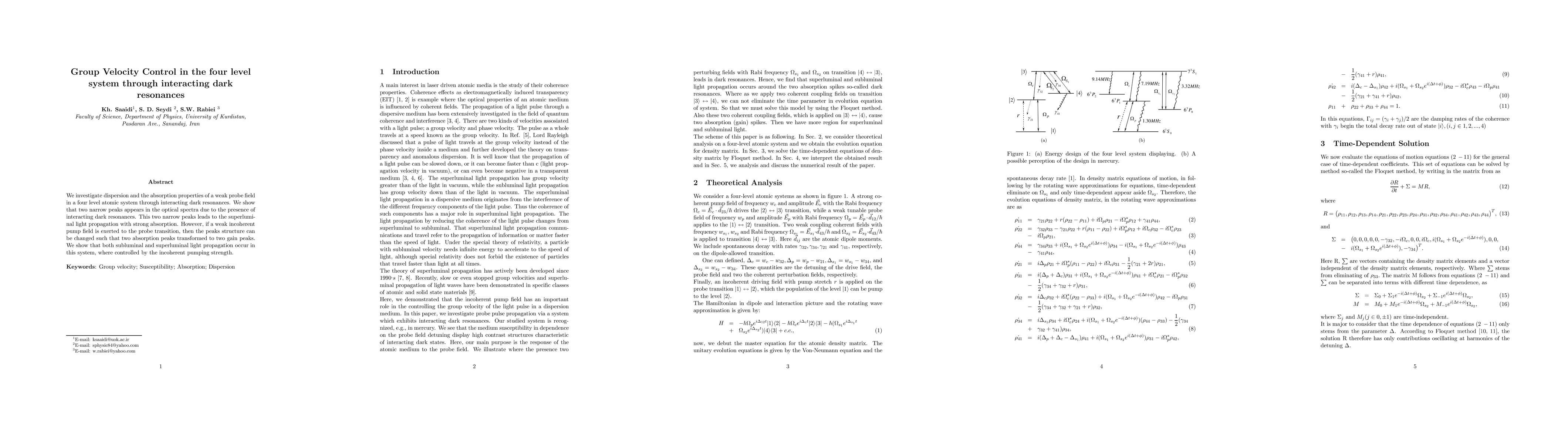 We investigate dispersion and absorption properties of a weak probe field in a four level atomic system through interacting dark resonances. We show that two narrow peaks appears in the optical spectra due to the presence of interacting dark resonances. This two narrow peaks leads to the superluminal light propagation with strong absorption. However, if a weak incoherent pump field is exerted to the probe transition, then the peaks structures can be changed such that two absorption peaks transformed to two gain deeps. We Show that both subluminal and superluminal light propagation occur in this system, where controlled by the incoherent pumping strength.