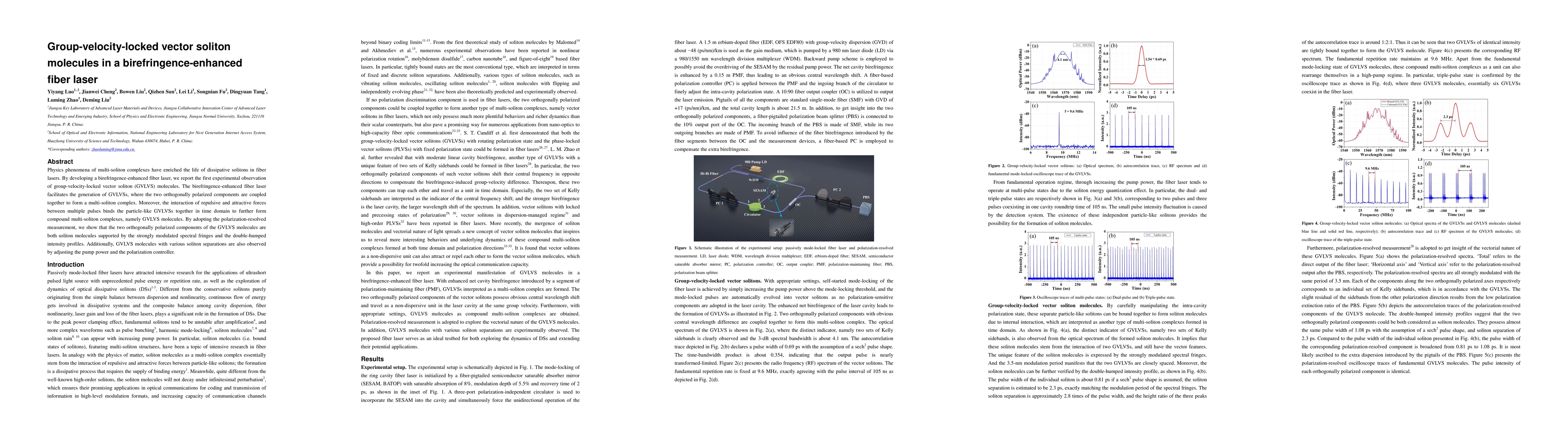 This paper reports the first experimental observation of group-velocity-locked vector soliton (GVLVS) molecules in a birefringence-enhanced fiber laser, where two orthogonally polarized soliton components are coupled to form multi-soliton complexes. The study demonstrates the formation of GVLVS molecules through the interaction of repulsive and attractive forces, confirmed by polarization-resolved measurements.