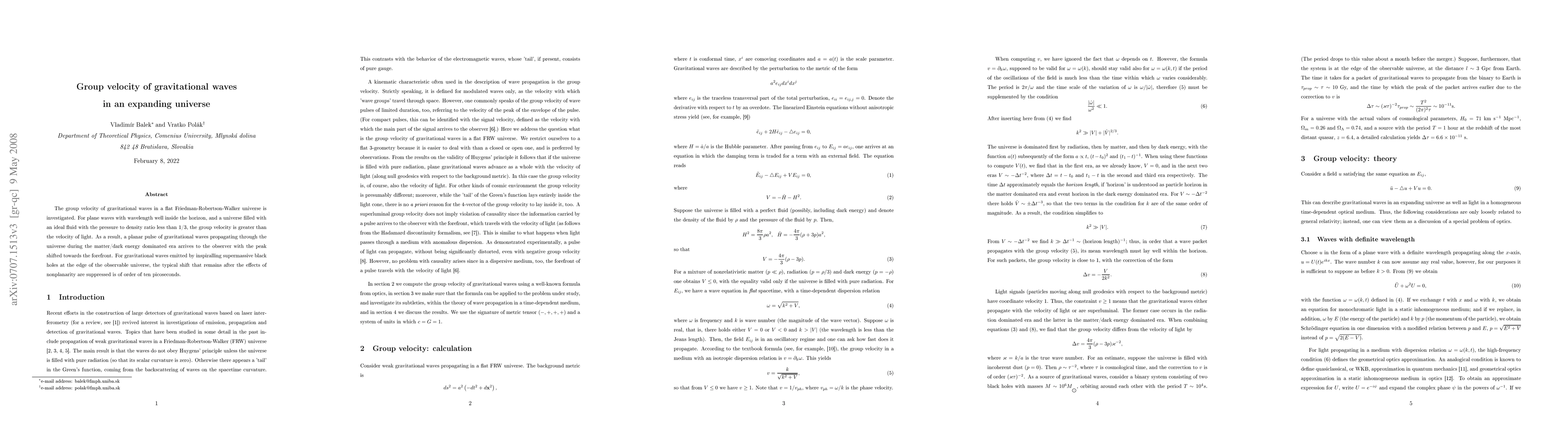 This paper investigates the group velocity of gravitational waves in an expanding universe, finding that for waves inside the horizon and in a universe dominated by matter, the group velocity exceeds the speed of light, causing a shift in the arrival time of gravitational wave pulses by about ten picoseconds.