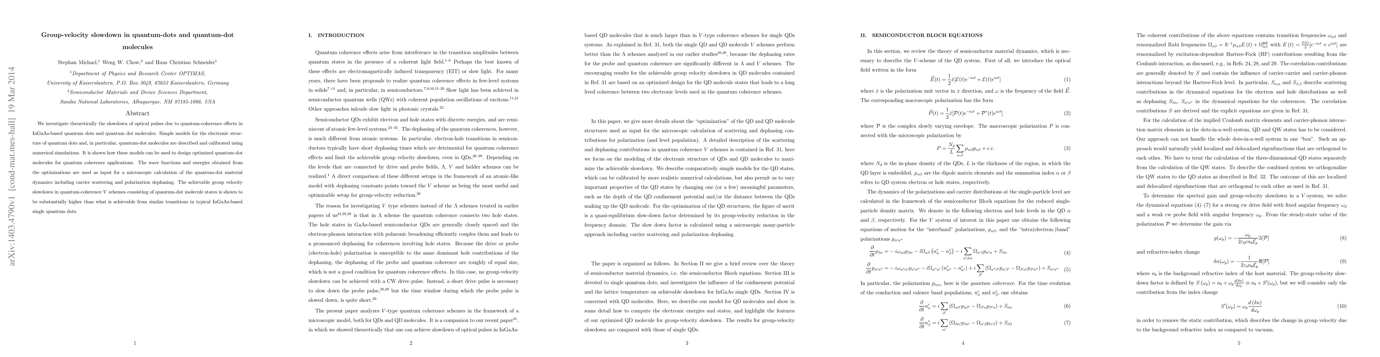 We investigate theoretically the slowdown of optical pulses due to quantum-coherence effects in InGaAs-based quantum dots and quantum dot molecules. Simple models for the electronic structure of quantum dots and, in particular, quantum-dot molecules are described and calibrated using numerical simulations. It is shown how these models can be used to design optimized quantum-dot molecules for quantum coherence applications. The wave functions and energies obtained from the optimizations are used as input for a microscopic calculation of the quantum-dot material dynamics including carrier scattering and polarization dephasing. The achievable group velocity slowdown in quantum-coherence V schemes consisting of quantum-dot molecule states is shown to be substantially higher than what is achievable from similar transitions in typical InGaAs-based single quantum dots.