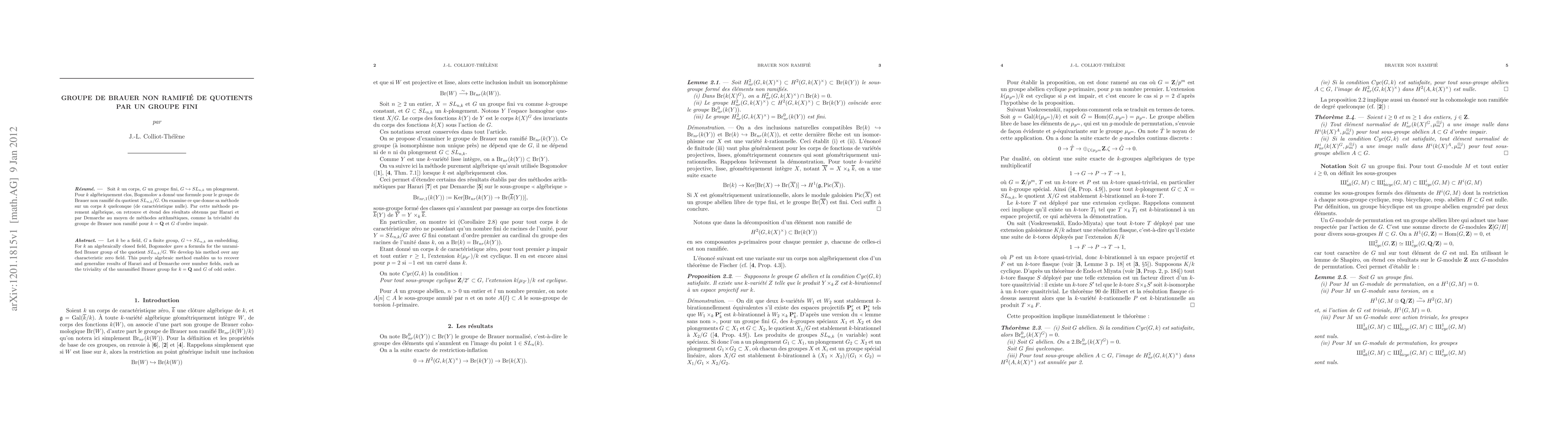 Let k be a field, G a finite group embedded in the k-group SL(n). For k an algebraically closed field, Bogomolov gave a formula for the unramified Brauer group of the quotient SL(n)/G. We develop his method over any characteristic zero field. This purely algebraic method enables us to recover and generalize results of Harari and of Demarche over number fields, such as the triviality of the unramified Brauer group for k=Q and G of odd order. --- Soient k un corps et G un groupe fini plong\'e dans le k-groupe SL(n).Pour k alg\'ebriquement clos, Bogomolov a donn\'e une formule pour le groupe de Brauer non ramifi\'e du quotient SL(n)/G. On examine ce que donne sa m\'ethode sur un corps k quelconque (de caract\'eristique nulle). Par cette m\'ethode purement alg\'ebrique, on retrouve et \'etend des r\'esultats obtenus par Harari et par Demarche au moyen de m\'ethodes arithm\'etiques, comme la trivialit\'e du groupe de Brauer non ramifi\'e pour k= Q et G d'ordre impair.