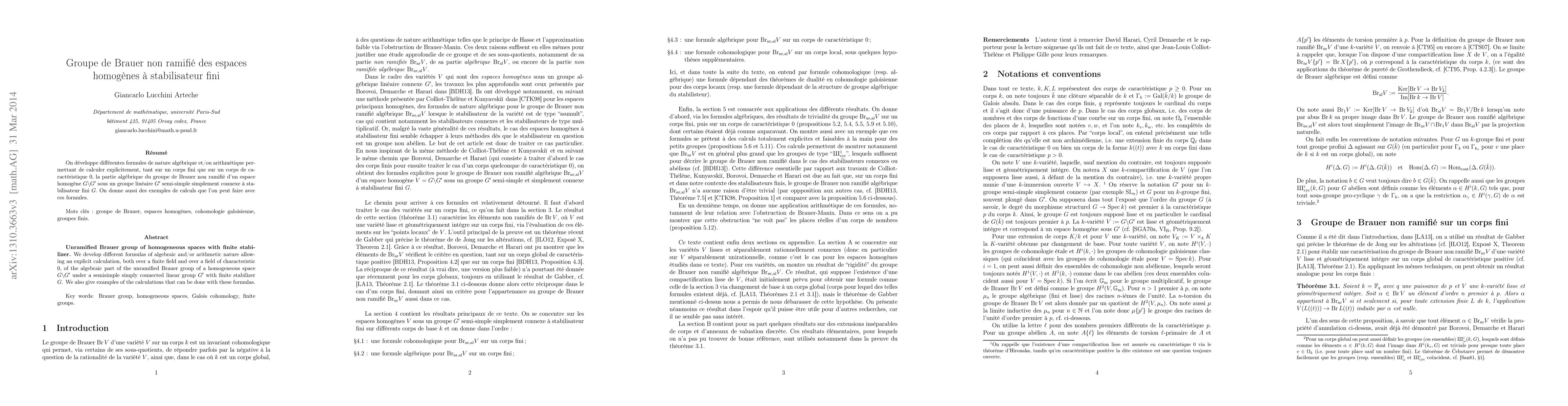 This paper presents formulas for calculating the algebraic part of the unramified Brauer group of homogeneous spaces with finite stabilizers over both finite fields and fields of characteristic 0, providing explicit examples of their application.