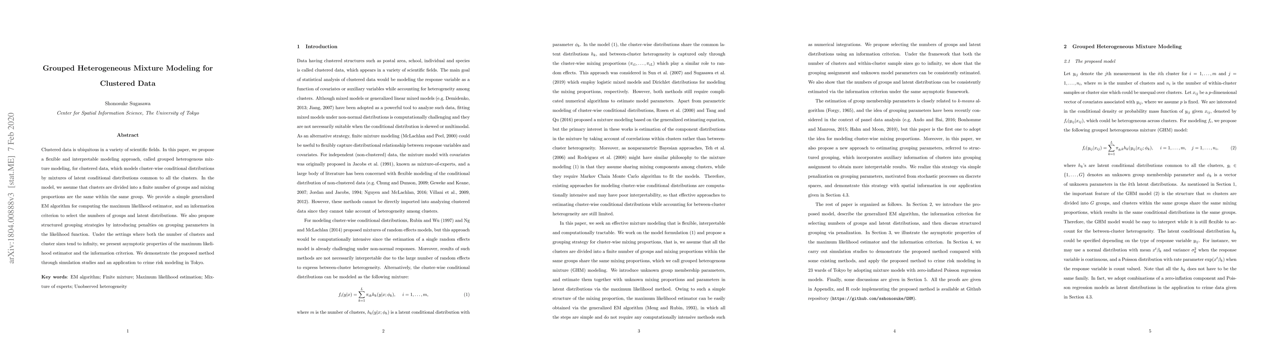 Clustered data is ubiquitous in a variety of scientific fields. In this paper, we propose a flexible and interpretable modeling approach, called grouped heterogenous mixture modeling, for clustered data, which models cluster-wise conditional distributions by mixtures of latent conditional distributions common to all the clusters. In the model, we assume that clusters are divided into a finite number of groups and mixing proportions are the same within the same group. We provide a simple generalized EM algorithm for computing the maximum likelihood estimator, and an information criterion to select the numbers of groups and latent distributions. We also propose structured grouping strategies by introducing penalties on grouping parameters in the likelihood function. Under the settings where both the number of clusters and cluster sizes tend to infinity, we present asymptotic properties of the maximum likelihood estimator and the information criterion. We demonstrate the proposed method through simulation studies and an application to crime risk modeling in Tokyo.