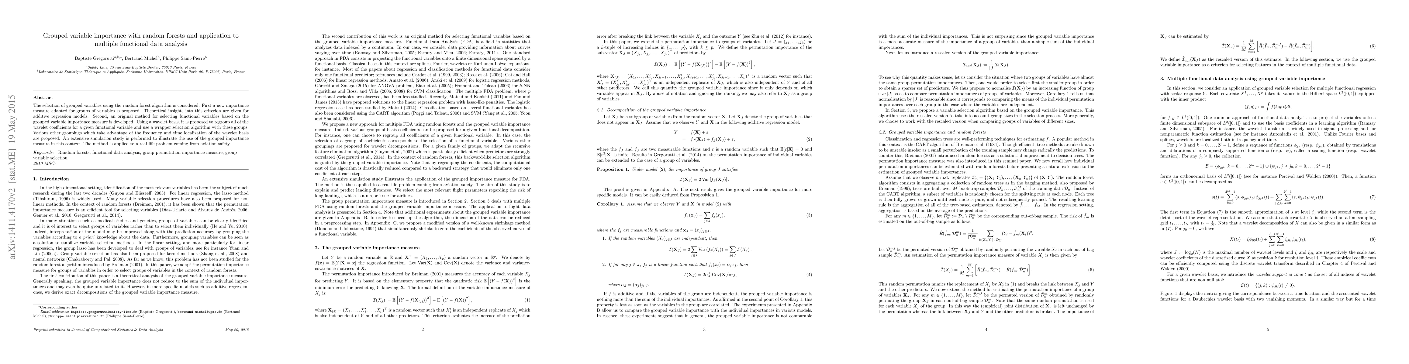 This paper proposes a new importance measure for grouped variables in random forests, particularly for additive regression models. It also develops a method for selecting functional variables based on this measure, using wavelet coefficients and various grouping strategies, and demonstrates its effectiveness through simulations and an application to aviation safety data.