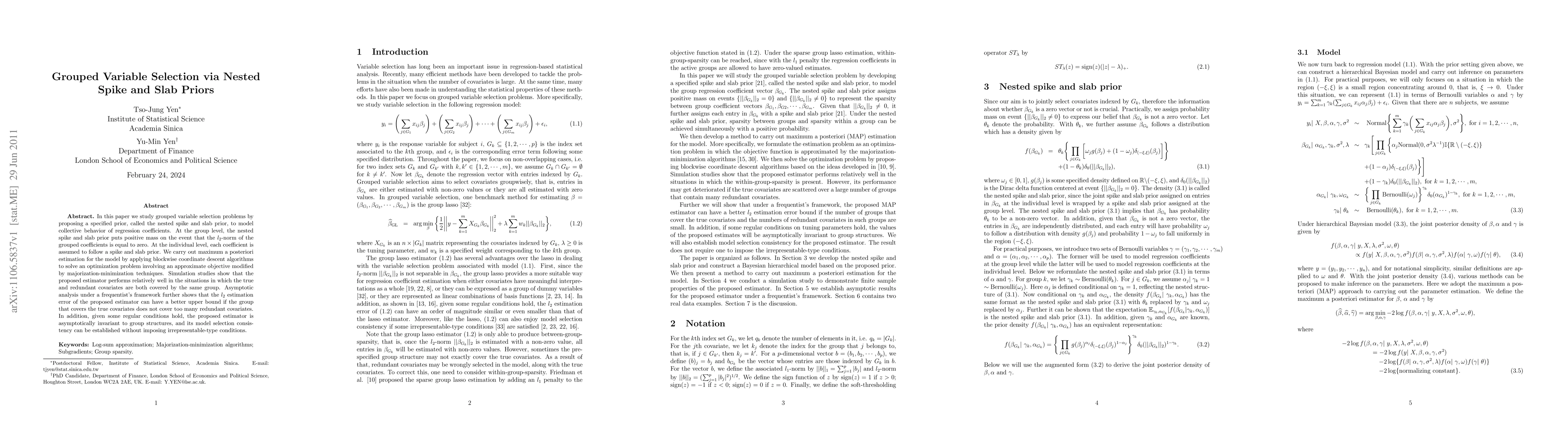 This paper proposes a nested spike and slab prior to tackle grouped variable selection problems, modeling collective behavior of regression coefficients. The method uses blockwise coordinate descent algorithms for maximum a posteriori estimation and shows good performance in simulations, especially when true covariates are in the same group as redundant ones.