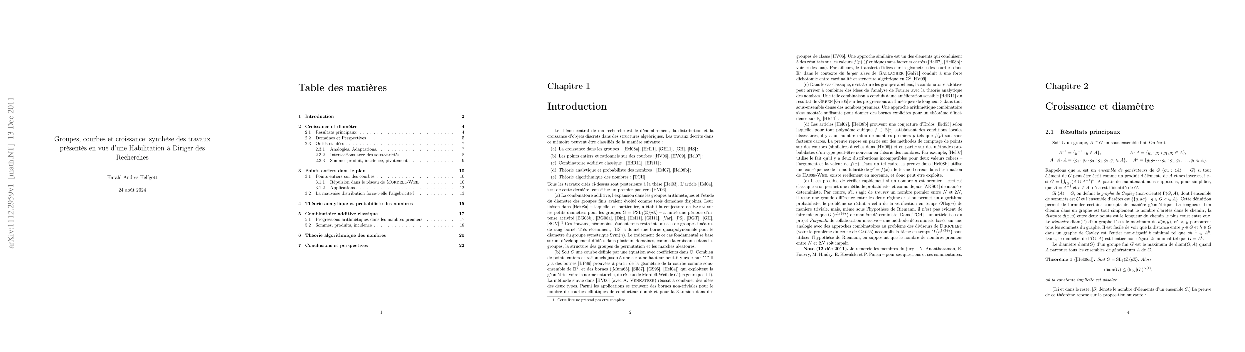 - Synth\`ese des travaux pr\'esent\'es en vue d'une Habilitation \`a Diriger des Recherches - Synthesis of works presented towards the Habilitation degree This is a summary (in French) of my work in number theory, group theory and combinatorics in the last eight years.