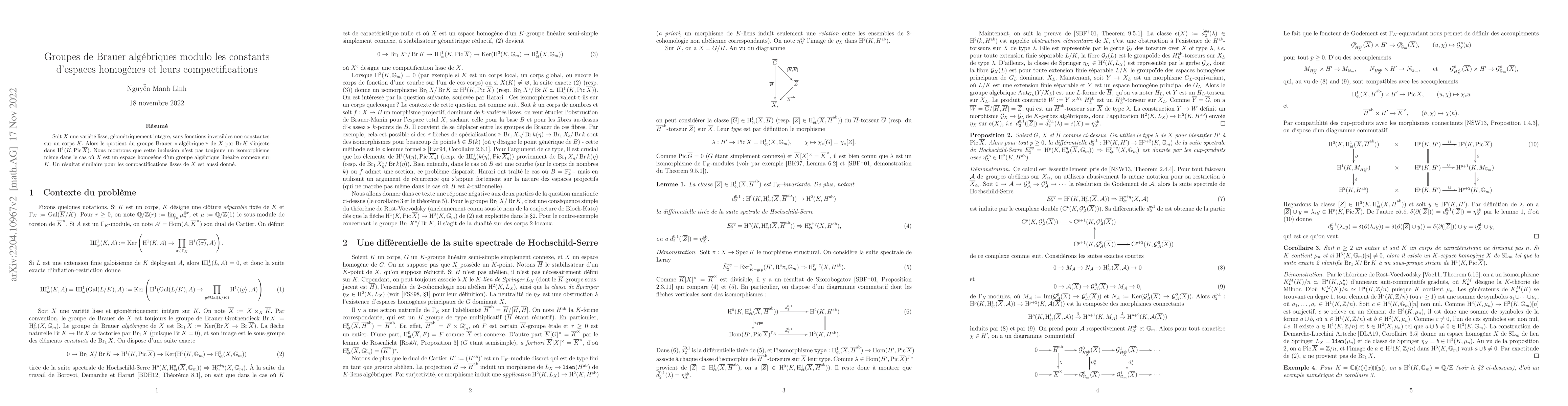Let $X$ be a smooth, geometrically integral variety over a field $K$. Then the quotient of the "algebraic" Brauer group of $X$ by $\operatorname{Br} K$ injects into $\textrm{H}^1(K,\textrm{Pic} \bar{X})$. We show that this inclusion is not always an isomorphism, even in the case where $X$ is a homogeneous space of a connected linear algebraic group over $K$. A similar result for the smooth compactifications of $X$ is also given. -- Soit $X$ une vari\'et\'e lisse, g\'eom\'etriquement int\`egre sur un corps $K$. Alors le quotient du groupe Brauer "alg\'ebrique" de $X$ par $\operatorname{Br} K$ s'injecte dans $\textrm{H}^1(K,\operatorname{Pic} \bar{X})$. Nous montrons que cette inclusion n'est pas toujours un isomorphisme m\^eme dans le cas o\`u $X$ est un espace homog\`ene d'un groupe alg\'ebrique lin\'eaire connexe sur $K$. Un r\'esultat similaire pour les compactifications lisses de $X$ est aussi donn\'e.