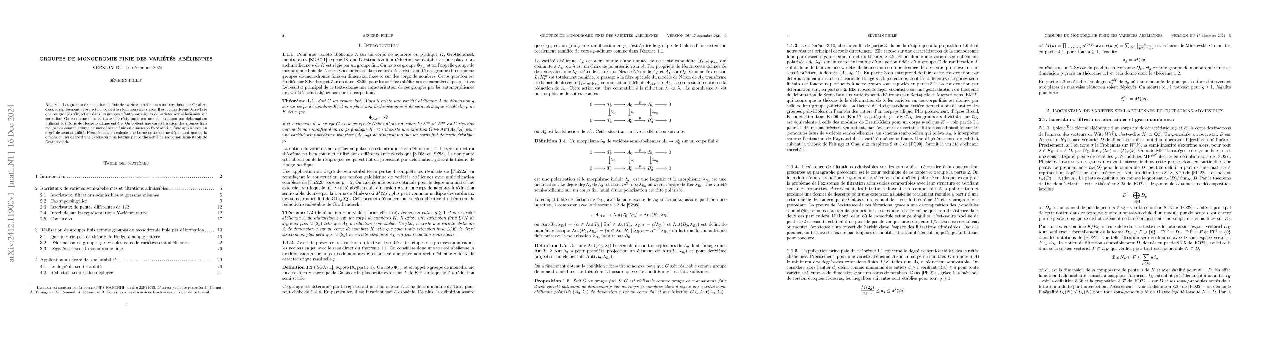 This paper introduces criteria for realizing finite groups as finite monodromy groups of abelian varieties over number fields, addressing local obstructions to semi-stable reduction. It provides an effective version of Grothendieck's semi-stable reduction theorem based on the degree of the extension relative to the dimension of the variety.