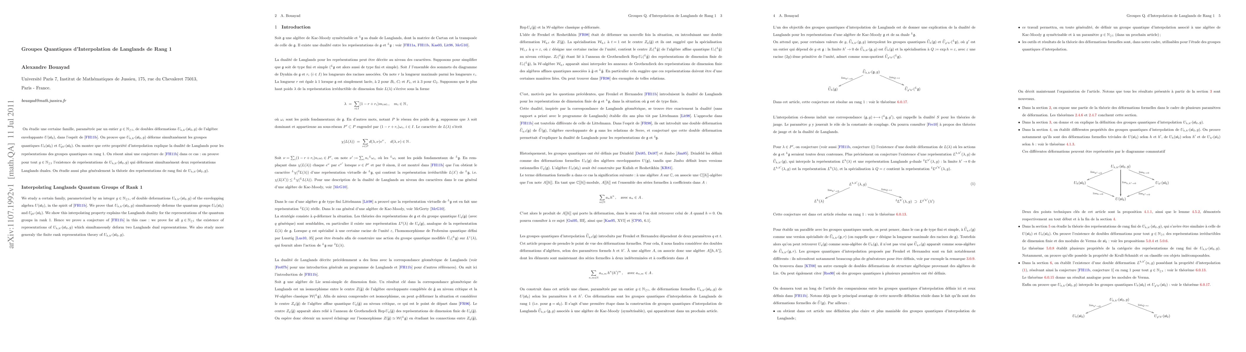 Interpolating Langlands Quantum Groups of Rank 1 -- We study a certain family, parameterized by an positive integer g, of double deformations of the envelopping algebra U(sl2), in the spirit of arXiv:0809.4453. We prove that each of these double deformations simultaneously deforms two rank 1 quantum groups. We show this interpolating property explains the Langlands duality for the representations of the quantum groups in rank 1. Hence we prove a conjecture of arXiv:0809.4453 in this case : we prove for all g the existence of representations which simultaneously deform two Langlands dual representations. We also study more generaly the finite rank representation theory of this family of double deformations. ----- On \'etudie une certaine famille, param\'etr\'ee par un entier g strictement positif, de doubles d\'eformations de l'alg\'ebre enveloppante U(sl2), dans l'esprit de arXiv:0809.4453. On prouve que chacune de ces doubles d\'eformations d\'eforme simultan\'ement deux groupes quantiques de rang 1. On montre que cette propri\'et\'e d'interpolation explique la dualit\'e de Langlands pour les repr\'esentations des groupes quantiques en rang 1. On r\'esout ainsi une conjecture de arXiv:0809.4453 dans ce cas : on prouve pour tout g l'existence de repr\'esentations qui d\'eforment simultan\'ement deux repr\'esentations Langlands duales. On \'etudie aussi plus g\'en\'eralement la th\'eorie des repr\'esentations de rang fini de de cette famille de doubles d\'eformations.