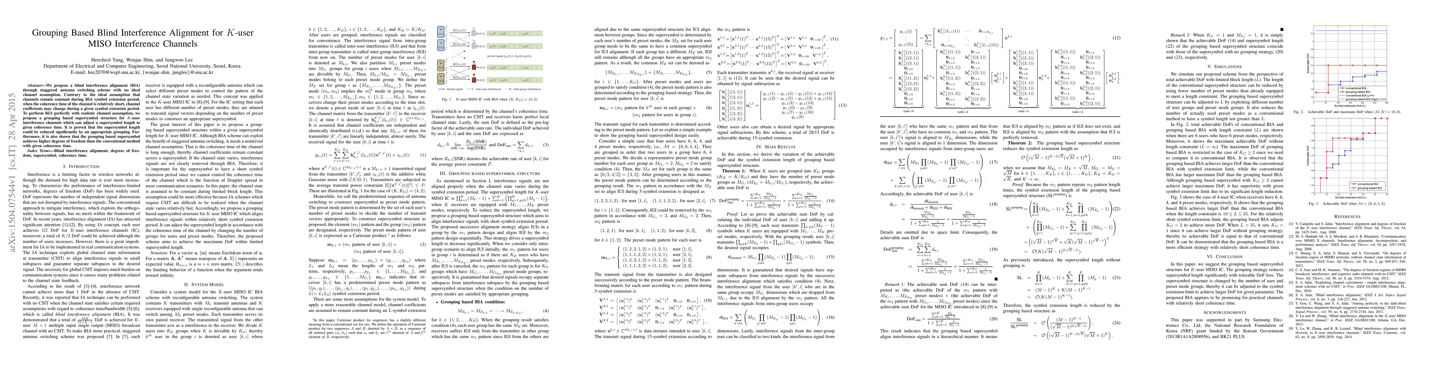 This paper proposes a grouping-based blind interference alignment scheme for K-user MISO interference channels that adjusts the supersymbol length according to channel coherence time, achieving higher degrees of freedom and reduced supersymbol length compared to conventional methods. The method accommodates channel variability during the symbol extension period.