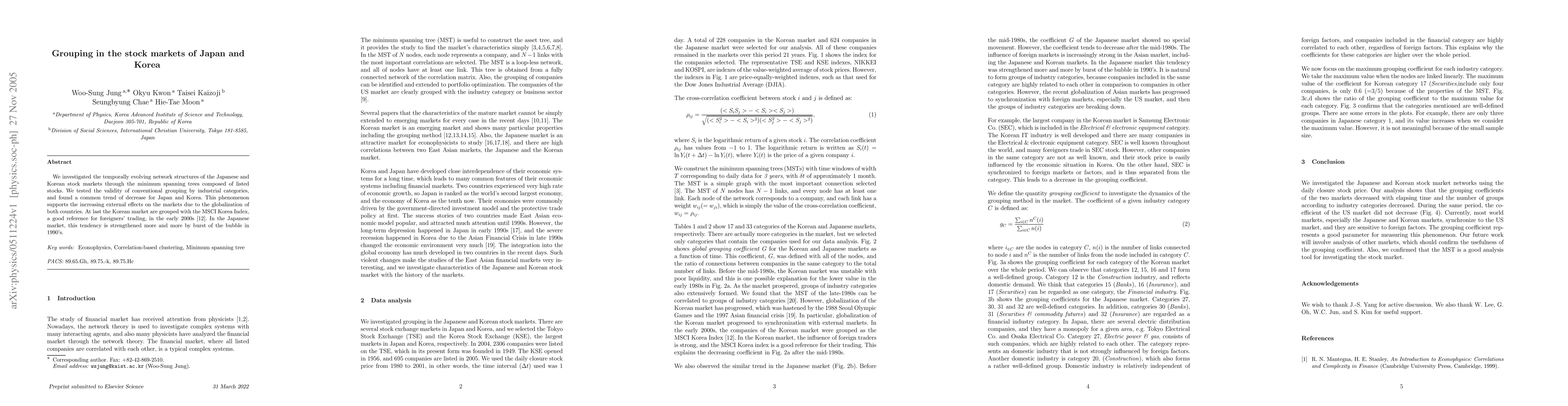 We investigated the temporally evolving network structures of the Japanese and Korean stock markets through the minimum spanning trees composed of listed stocks. We tested the validity of conventional grouping by industrial categories, and found a common trend of decrease for Japan and Korea. This phenomenon supports the increasing external effects on the markets due to the globalization of both countries. At last the Korean market are grouped with the MSCI Korea Index, a good reference for foreigners' trading, in the early 2000s \cite{Jung2006}. In the Japanese market, this tendency is strengthened more and more by burst of the bubble in 1990's.