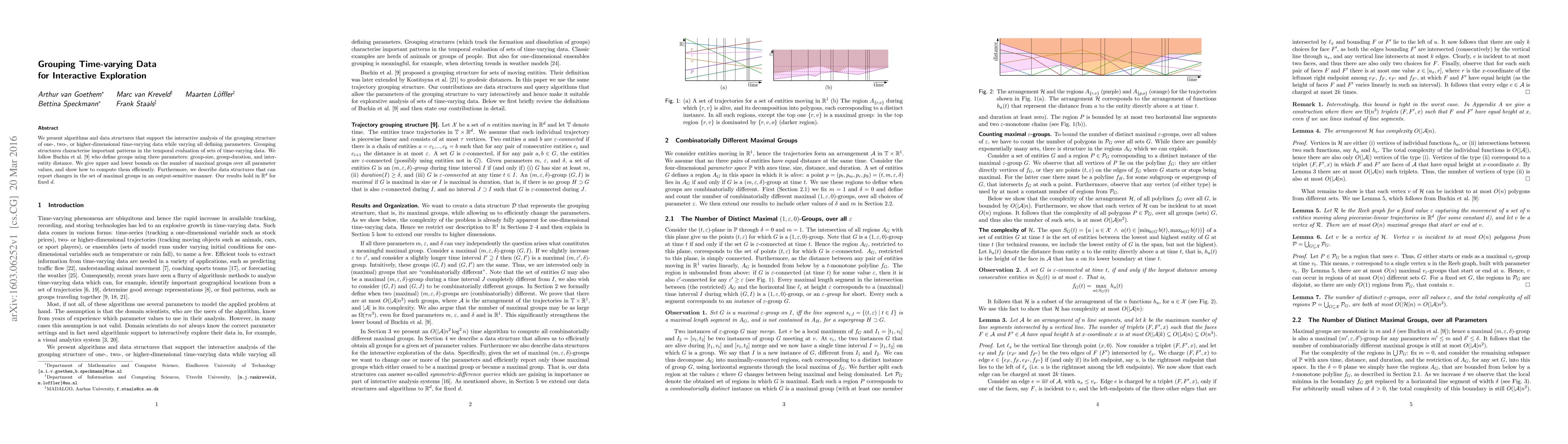 This paper introduces algorithms and data structures for interactively analyzing time-varying data groupings, defined by group-size, group-duration, and inter-entity distance. It provides efficient computation methods for determining maximal groups and supports dynamic updates in response to parameter changes.