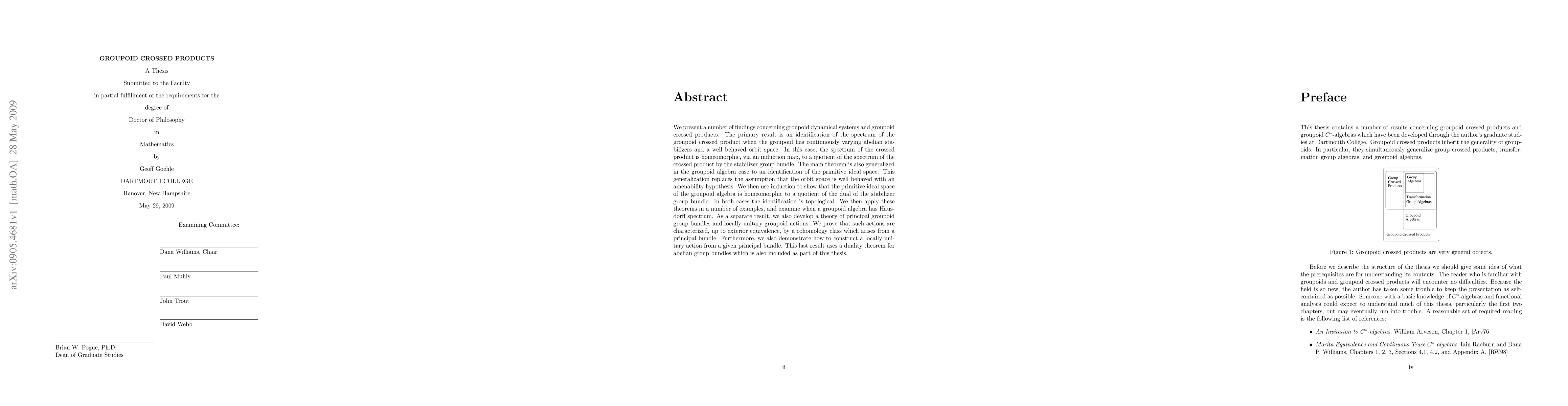We present a number of findings concerning groupoid dynamical systems and groupoid crossed products. The primary result is an identification of the spectrum of the groupoid crossed product when the groupoid has continuously varying abelian stabilizers and a well behaved orbit space. In this case, the spectrum of the crossed product is homeomorphic, via an induction map, to a quotient of the spectrum of the crossed product by the stabilizer group bundle. The main theorem is also generalized in the groupoid algebra case to an identification of the primitive ideal space. This generalization replaces the assumption that the orbit space is well behaved with an amenability hypothesis. We then use induction to show that the primitive ideal space of the groupoid algebra is homeomorphic to a quotient of the dual of the stabilizer group bundle. In both cases the identification is topological. We then apply these theorems in a number of examples, and examine when a groupoid algebra has Hausdorff spectrum. As a separate result, we also develop a theory of principal groupoid group bundles and locally unitary groupoid actions. We prove that such actions are characterized, up to exterior equivalence, by a cohomology class which arises from a principal bundle. Furthermore, we also demonstrate how to construct a locally unitary action from a given principal bundle. This last result uses a duality theorem for abelian group bundles which is also included as part of this thesis.