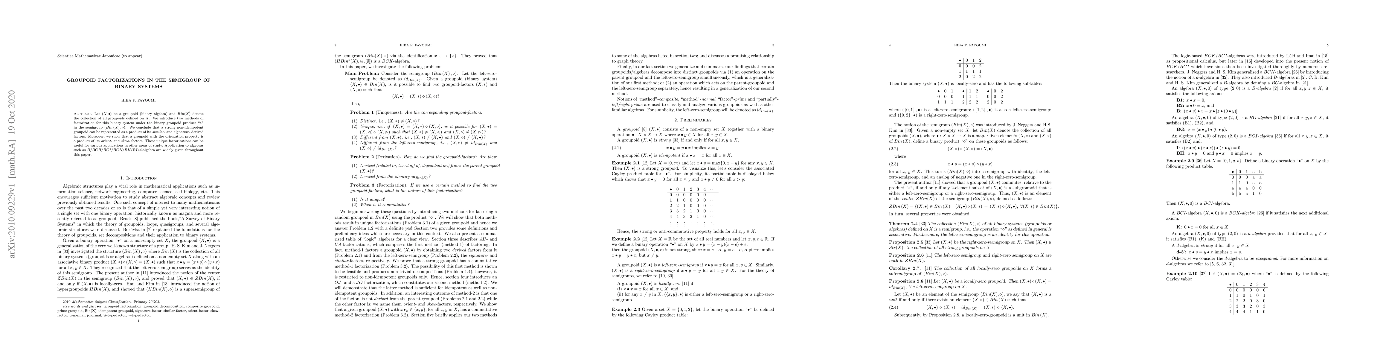 Let $(X,\bullet )$ be a groupoid (binary algebra) and $Bin(X\dot{)}$ denote the collection of all groupoids defined on $X$. We introduce two methods of factorization for this binary system under the binary groupoid product \textquotedblleft $\diamond $\textquotedblright\ in the semigroup $\left( Bin\left( X\right) ,\diamond \right) $. We conclude that a strong non-idempotent groupoid can be represented as a product of its \textit{% similar-} and \textit{signature-} derived factors. Moreover, we show that a groupoid with the orientation property is a product of its \textit{orient-} and \textit{skew-} factors. These unique factorizations can be useful for various applications in other areas of study. Application to algebras such as $B/BCH/BCI/BCK/BH/BI/d$-algebra are widely given throughout this paper.