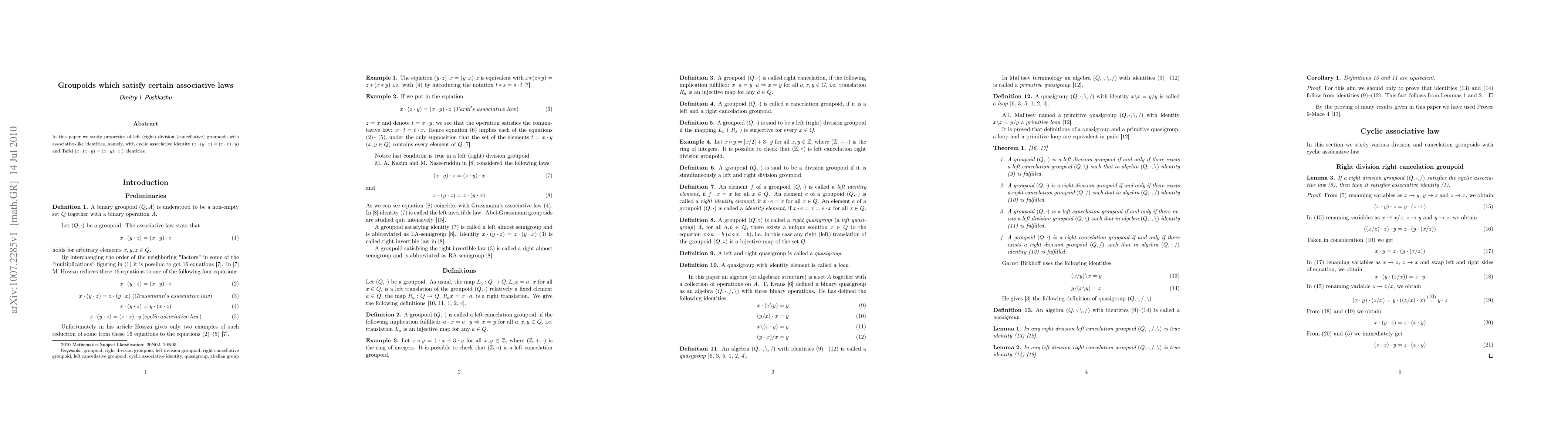 This paper investigates properties of left and right division, cancellative groupoids that adhere to cyclic associative and Tarki associative identities. It focuses on the implications and characteristics of these associative-like laws within groupoids.