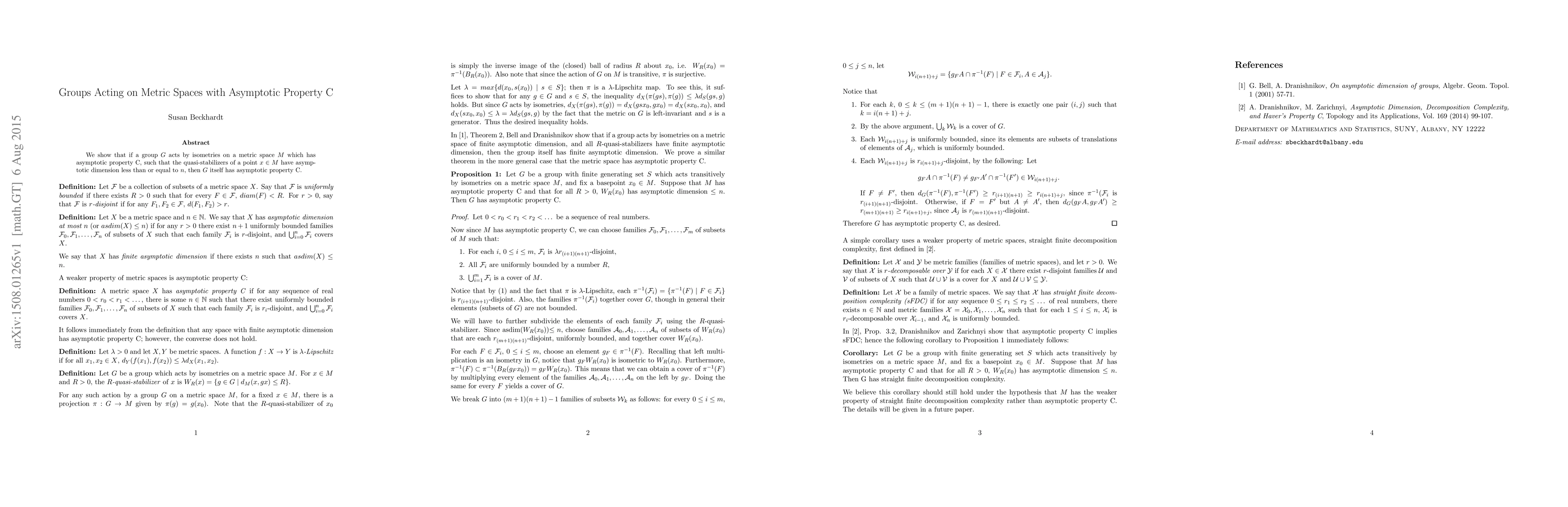Summary: The paper demonstrates that a group $G$ acting by isometries on a metric space $M$ with asymptotic property C will itself possess asymptotic property C if the quasi-stabilizers of any point $x \in M$ have asymptotic dimension ≤ $n$. This result extends the property to the group level.