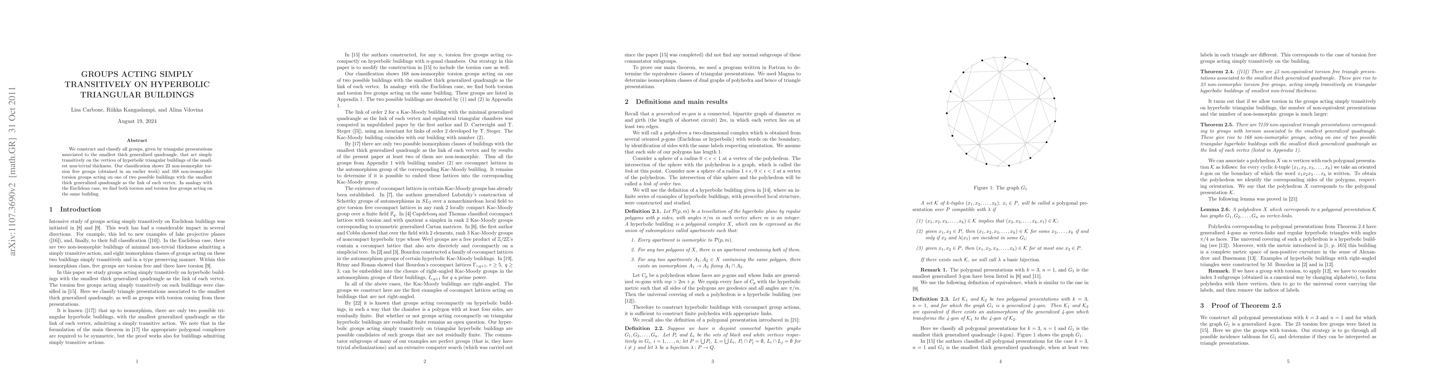 This paper constructs and classifies groups with triangular presentations acting simply transitively on the vertices of hyperbolic triangular buildings. It identifies 23 torsion-free and 168 torsion groups, revealing both types acting on the same building, analogous to the Euclidean case.