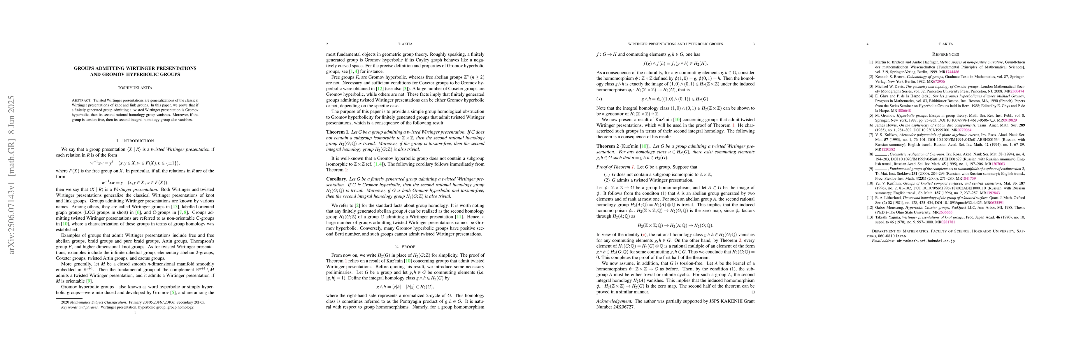 Twisted Wirtinger presentations are generalizations of the classical Wirtinger presentations of knot and link groups. In this paper, we prove that if a finitely generated group admitting a twisted Wirtinger presentation is Gromov hyperbolic, then its second rational homology group vanishes. Moreover, if the group is torsion-free, then its second integral homology group also vanishes.