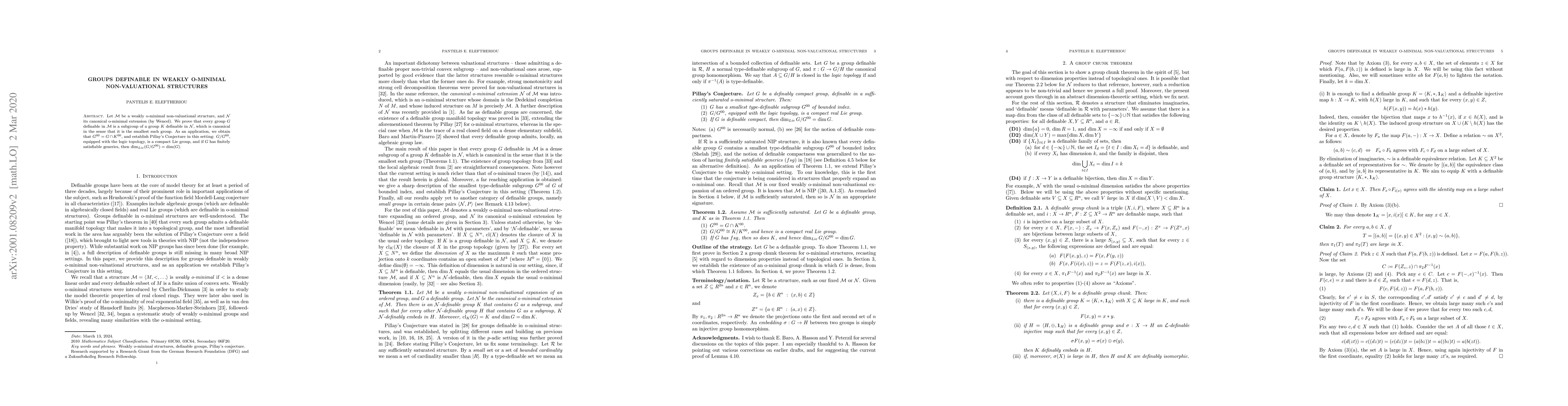 This paper proves that any group definable in a weakly o-minimal non-valuational structure $\mathcal M$ is a subgroup of a canonical group in its o-minimal extension $\mathcal N$. It also establishes Pillay's Conjecture, showing that $G/G^{00}$ is a compact Lie group with a dimension equal to that of $G$ if $G$ has finitely satisfiable generics.