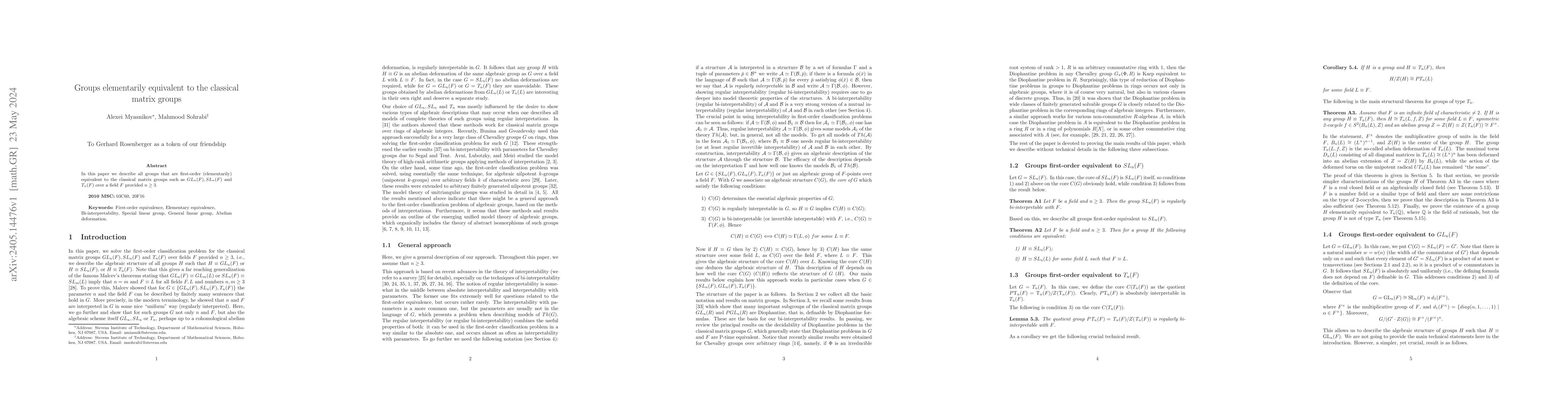Summary: This paper identifies all groups that are first-order equivalent to classical matrix groups like $GL_n(F), SL_n(F),$ and $T_n(F)$ over a field $F$ when $n \geq 3$, exploring their structural and logical properties.