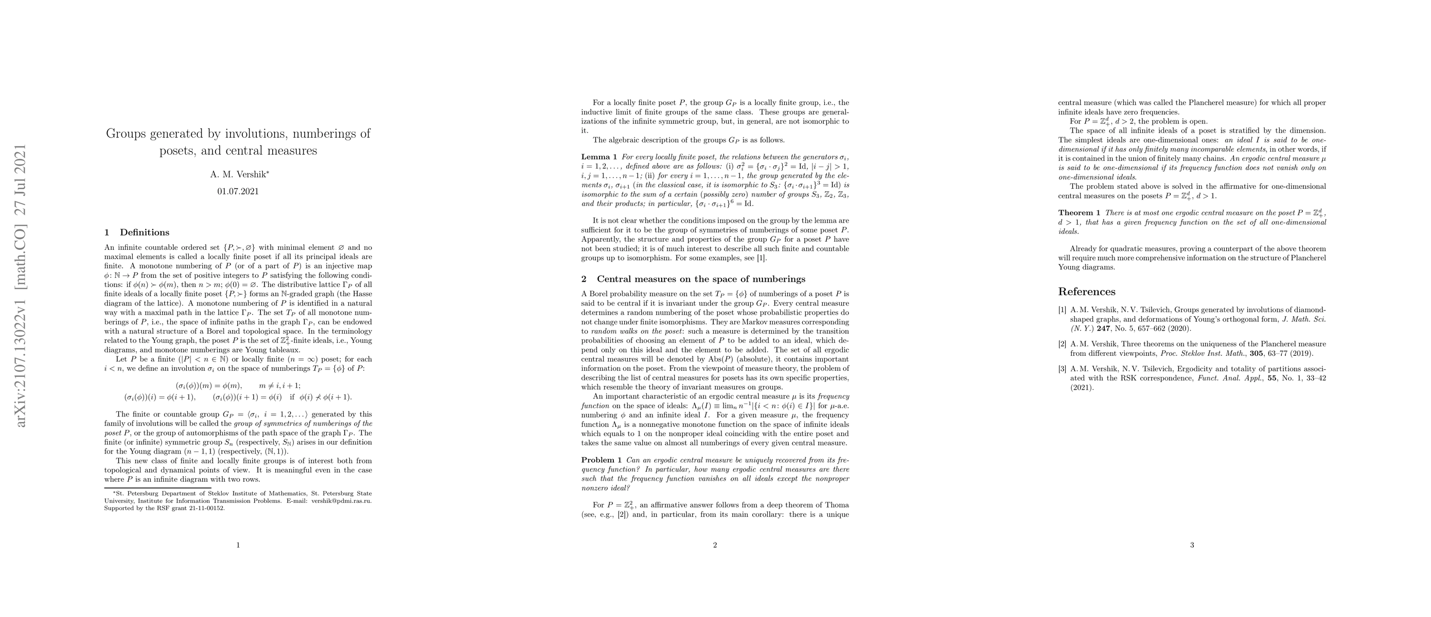 We define a new class of countable groups, which are defined by its action on the set of monotonic numberings (diagrams) of an arbitrary finite or countable partial ordered set (poset). These groups are generated by the set of involutions? and in the case of finite posets could be considered as generalization of Coxeter's symmetric groups. We discuss the problems concerned to infinite groups jf this type, in particular the problem of the descripton of invariant measures on the space of numberings (central measures)with respect to actions of those groups. The probelms are tightly connected with the new theory of representations of the generalizations of infinite symmetric group.