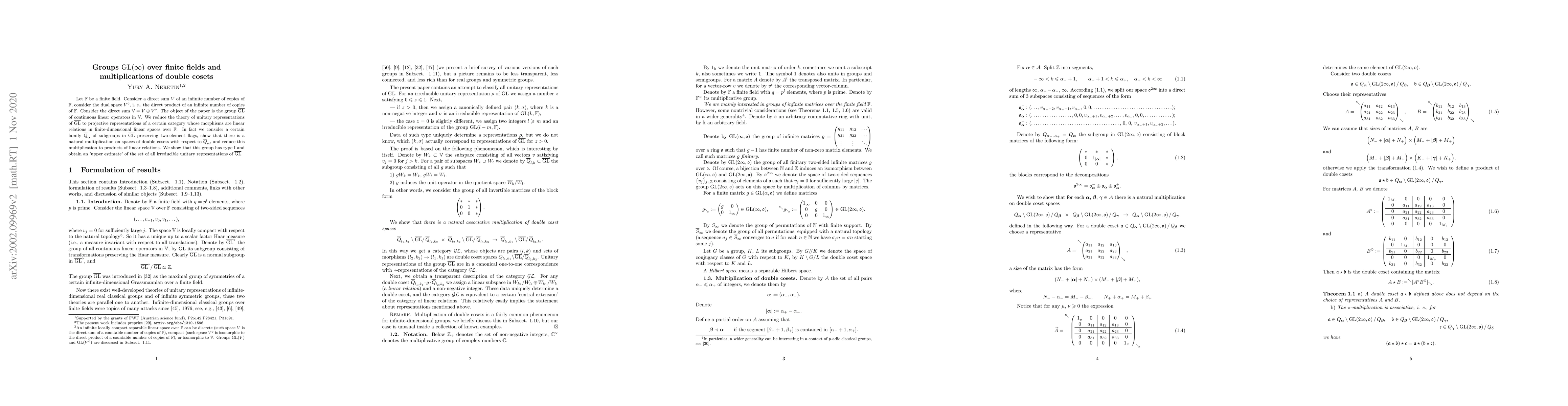 Let $\mathbb F$ be a finite field. Consider a direct sum $V$ of an infinite number of copies of $\mathbb F$, consider the dual space $V^\diamond$, i.~e., the direct product of an infinite number of copies of $\mathbb F$. Consider the direct sum ${\mathbb V}=V\oplus V^\diamond$. The object of the paper is the group $\mathbf{GL}$ of continuous linear operators in $\mathbb V$. We reduce the theory of unitary representations of $\mathbf{GL}$ to projective representations of a certain category whose morphisms are linear relations in finite-dimensional linear spaces over $\mathbb F$. In fact we consider a certain family $ Q_\alpha$ of subgroups in $\mathbb V$ preserving two-element flags, show that there is a natural multiplication on spaces of double cosets with respect to $ Q_\alpha$, and reduce this multiplication to products of linear relations. We show that this group has type $\mathrm{I}$ and obtain an 'upper estimate' of the set of all irreducible unitary representations of $\mathbf{GL}$.
