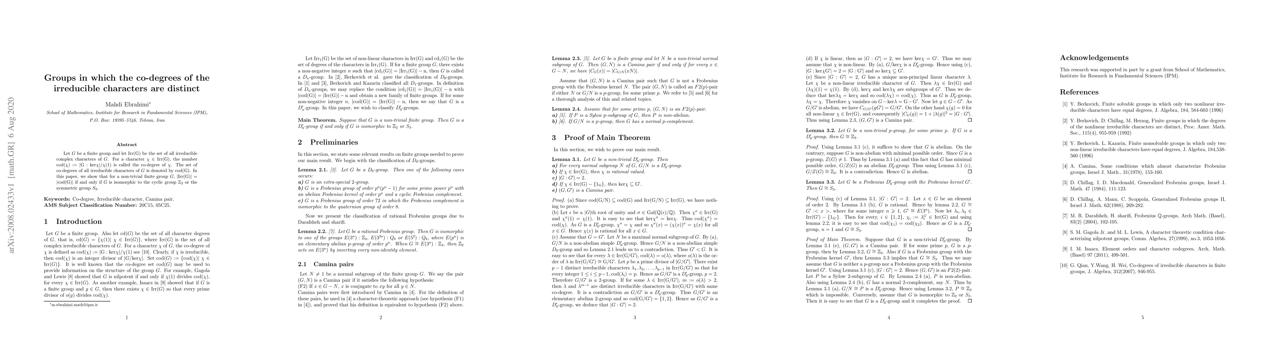 A finite group $G$ has distinct co-degrees for its irreducible characters if and only if it is isomorphic to $ ext{Z}_2$ or $ ext{S}_3$.