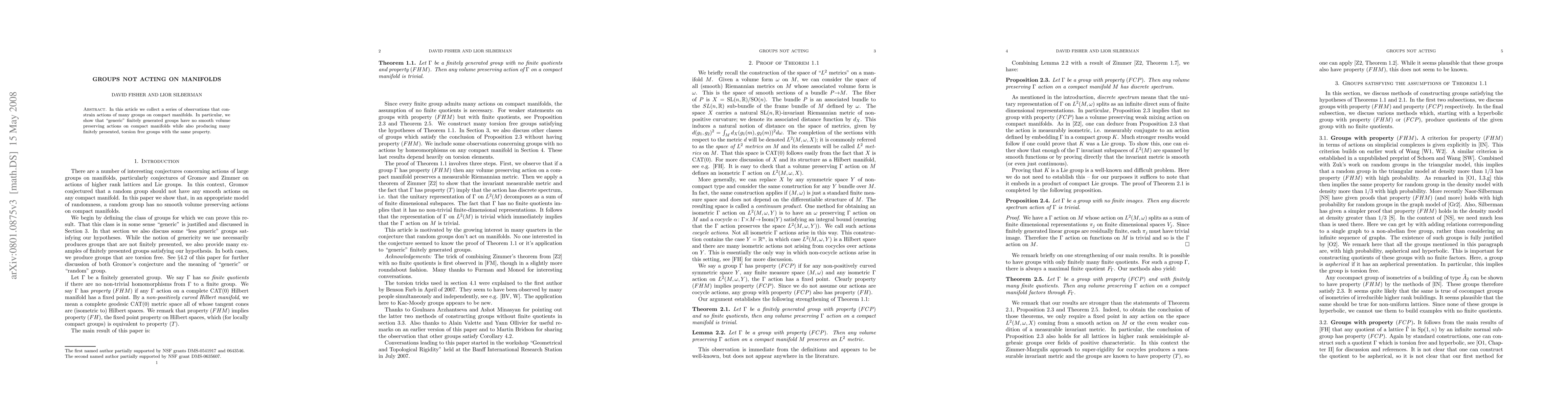 This paper examines constraints on group actions on compact manifolds, demonstrating that "generic" finitely generated groups lack smooth volume-preserving actions, and identifies many finitely presented, torsion-free groups with this characteristic.